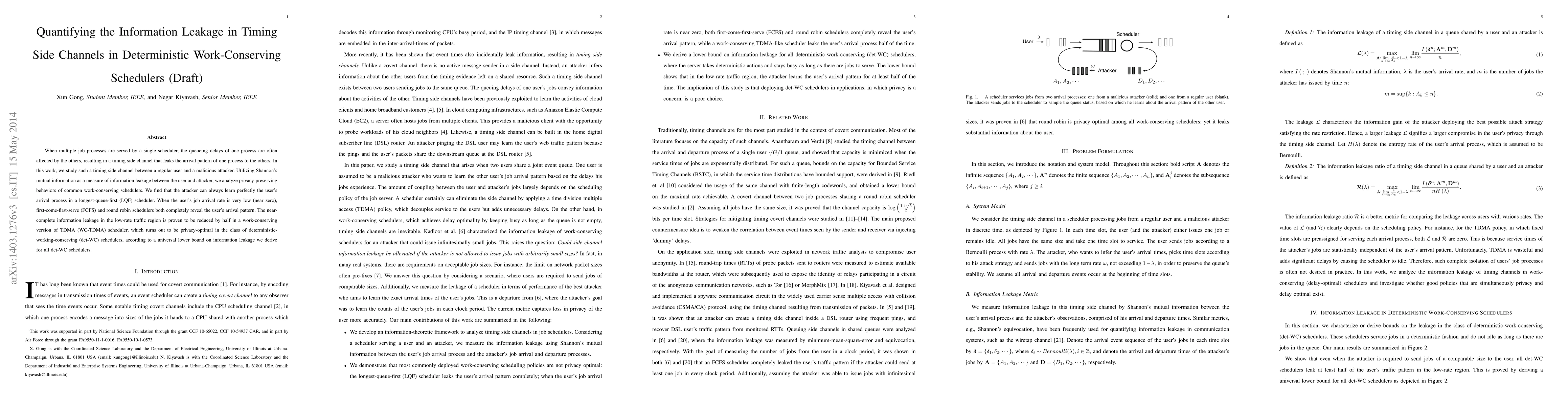 This paper quantifies information leakage in timing side channels of deterministic work-conserving schedulers, finding that attackers can perfectly infer user arrival patterns in LQF schedulers and partially reveal patterns in FCFS and round robin. The work-conserving TDMA scheduler is shown to be privacy-optimal, reducing leakage by half.