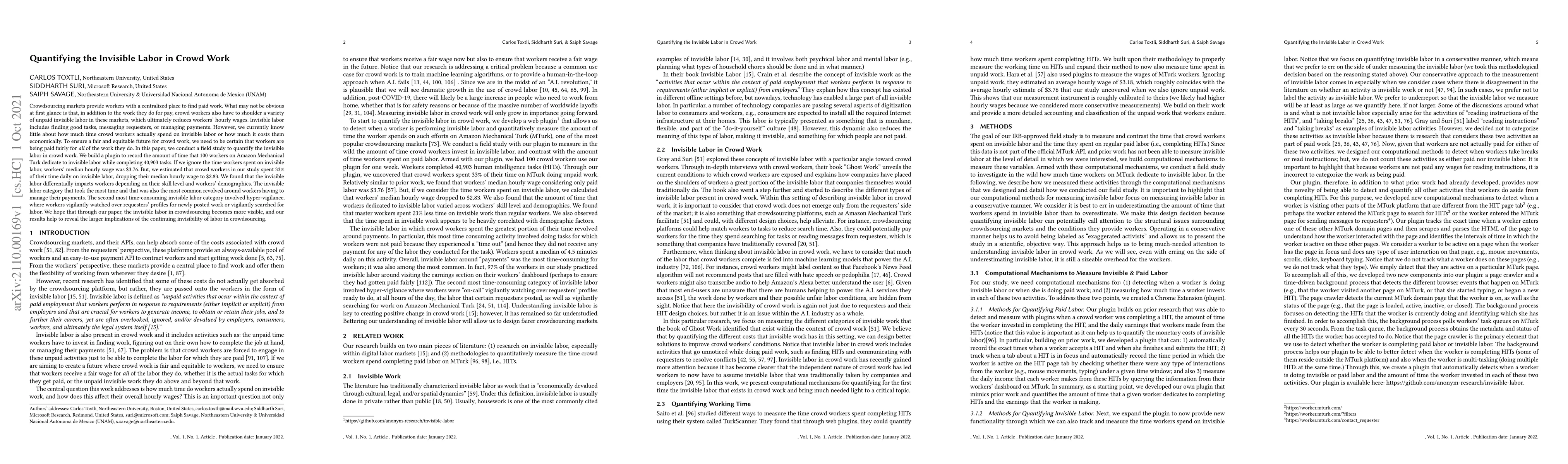 This paper quantifies the invisible labor performed by crowd workers on platforms like Amazon Mechanical Turk, revealing that workers spend 33% of their time on unpaid tasks such as managing payments and hyper-vigilance, reducing their median hourly wage from $3.76 to $2.83. The study calls for greater awareness and fairer compensation in crowdsourcing markets.