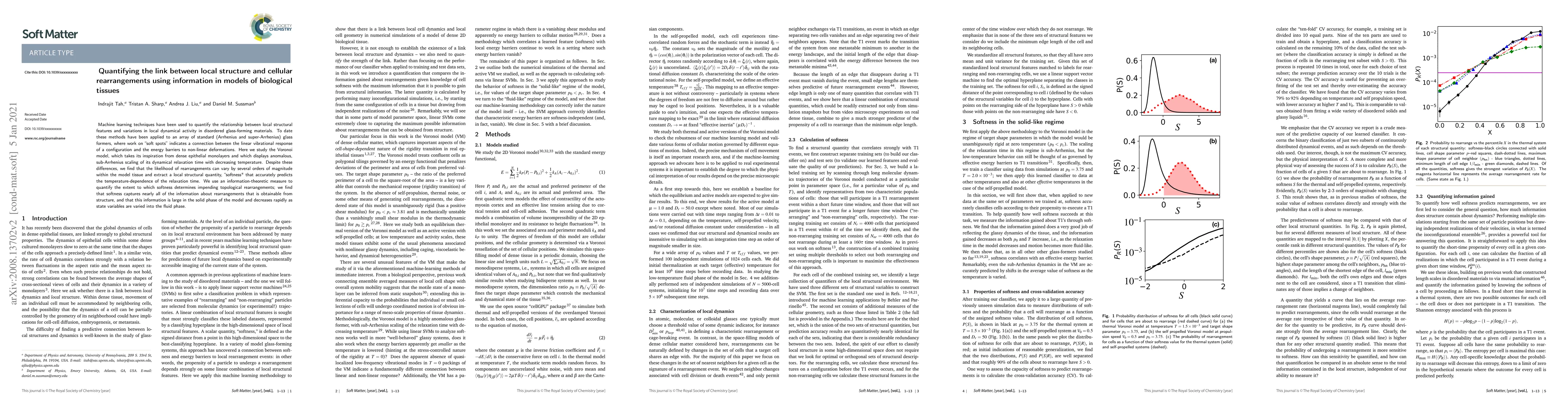 This paper uses machine learning to explore the relationship between local structural features and cellular rearrangements in a Voronoi model inspired by dense epithelial monolayers. It finds that a local structural quantity, "softness," accurately predicts the temperature-dependence of relaxation times and captures nearly all the information about rearrangements in the solid phase.