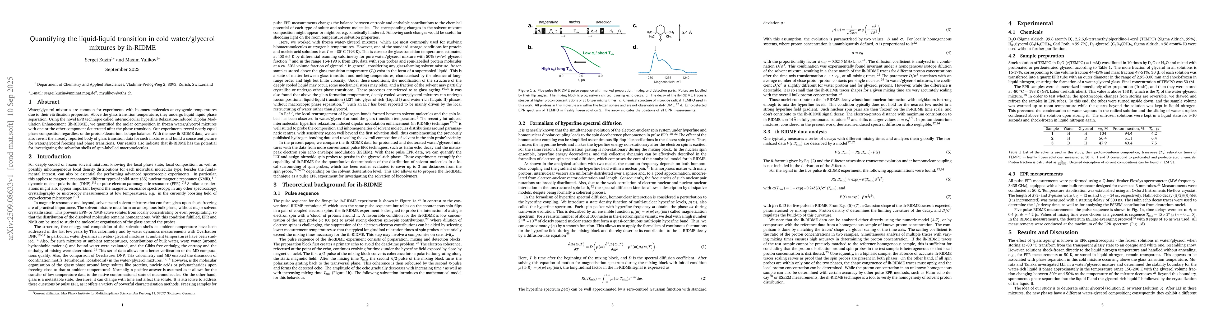 Water/glycerol mixtures are common for experiments with biomacromolecules at cryogenic temperatures due to their vitrification properties. Above the glass transition temperature, they undergo liquid-liquid phase separation. Using the novel EPR technique called intermolecular hyperfine Relaxation-Induced Dipolar Modulation Enhancement (ih-RIDME), we quantified the molar composition in frozen water/glycerol mixtures with one or the other component deuterated after the phase transition. Our experiments reveal nearly equal phase composition regardless of the proton/deuterium isotope balance. With the new ih-RIDME data, we can also revisit the already reported body of glass transition data for such mixtures and build a consistent picture for water/glycerol freezing and phase transitions. Our results also indicate that ih-RIDME has the potential for investigating the solvation shells of spin-labelled macromolecules.