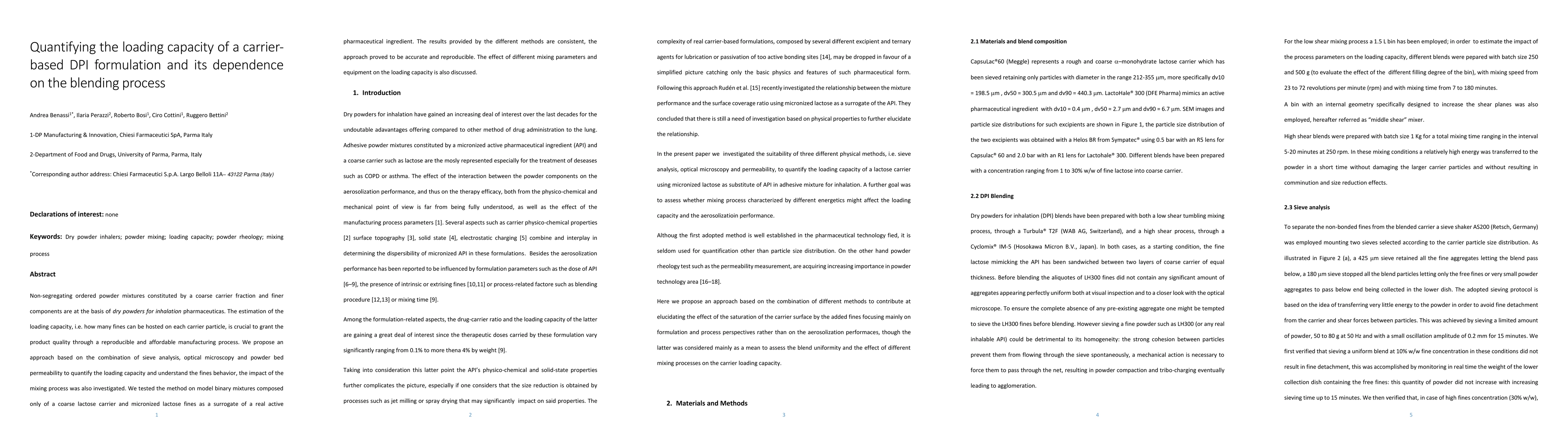 Non-segregating ordered powder mixtures constituted by a coarse carrier fraction and finer components are at the basis of dry powders for inhalation pharmaceuticas. The estimation of the loading capacity, i.e. how many fines can be hosted on each carrier particle, is crucial to grant the product quality through a reproducible and affordable manufacturing process. We propose an approach based on the combination of sieve analysis, optical microscopy and powder bed permeability to quantify the loading capacity and understand the fines behavior, the impact of the mixing process was also investigated. We tested the method on model binary mixtures composed only of a coarse lactose carrier and micronized lactose fines as a surrogate of a real active pharmaceutical ingredient. The results provided by the different methods are consistent, the approach proved to be accurate and reproducible. The effect of different mixing parameters and equipment on the loading capacity is also discussed.