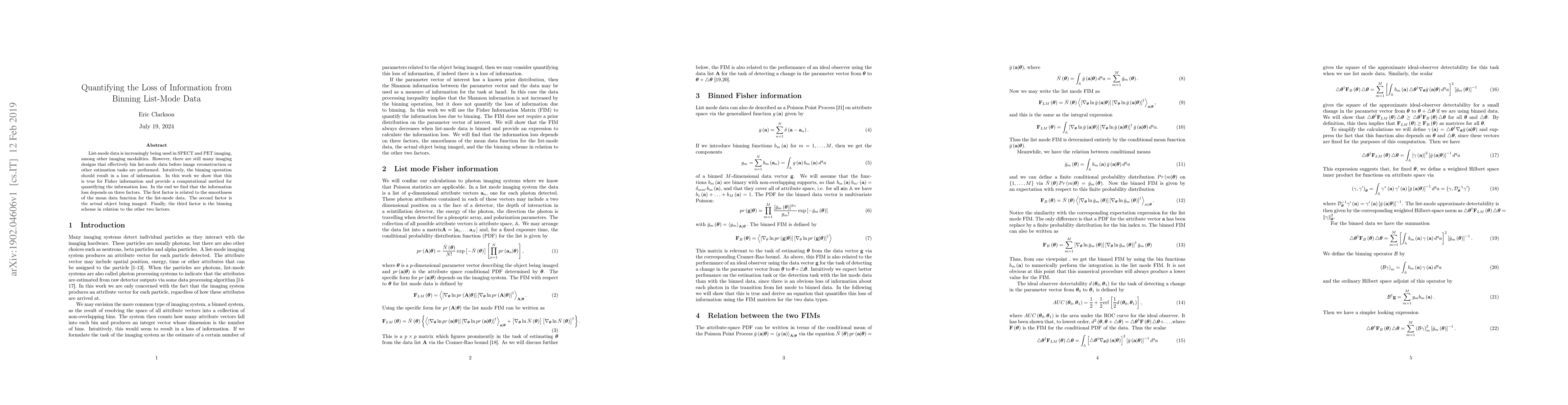 This paper quantifies the information loss from binning list-mode data in imaging applications like SPECT and PET. It demonstrates that binning results in Fisher information loss, which depends on the smoothness of the mean data function, the imaged object, and the binning scheme.