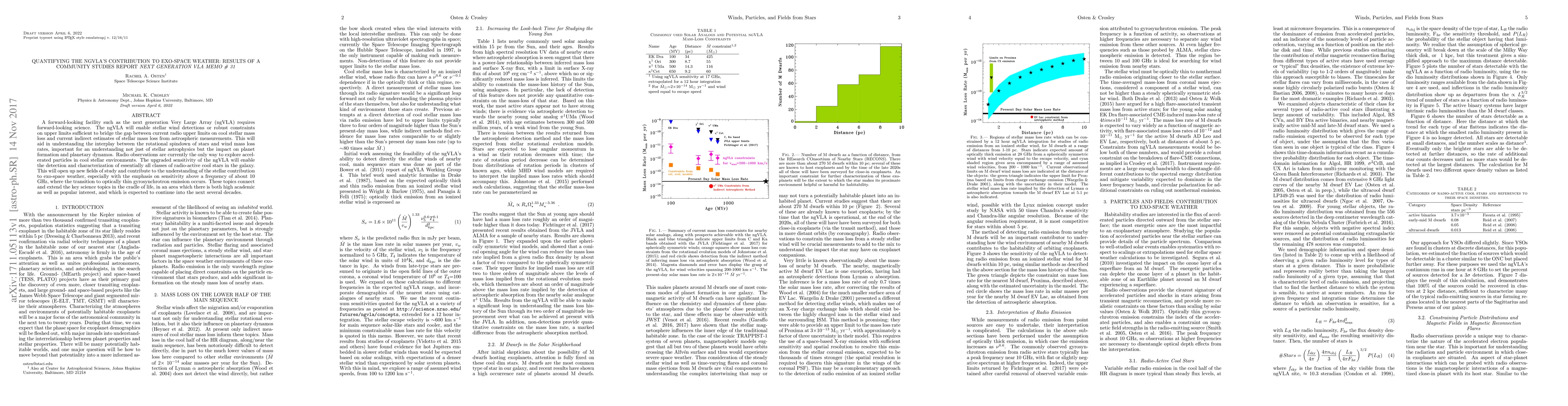 A forward-looking facility such as the next generation Very Large Array (ngVLA) requires forward-looking science. The ngVLA will enable stellar wind detections or robust constraints on upper limits sufficient to bridge the gap between current radio upper limits on cool stellar mass loss and current indirect estimates of stellar mass loss from astrospheric measurements. This will aid in understanding the interplay between the rotational spindown of stars and wind mass loss rates, important for an understanding not just of stellar astrophysics but the impact on planet formation and planetary dynamos. Radio observations are currently the only way to explore accelerated particles in cool stellar environments. The upgraded sensitivity of the ngVLA will enable the detection and characterization of essentially all classes of radio-active cool stars in the galaxy. This will open up new fields of study and contribute to the understanding of the stellar contribution to exo-space weather, especially with the emphasis on sensitivity above a frequency of about 10 GHz, where the transition to optically thin gyrosynchrotron emission occurs. These topics connect and extend the key science topics in the cradle of life, in an area which there is both high academic as well as popular interest, and which is expected to continue into the next several decades.