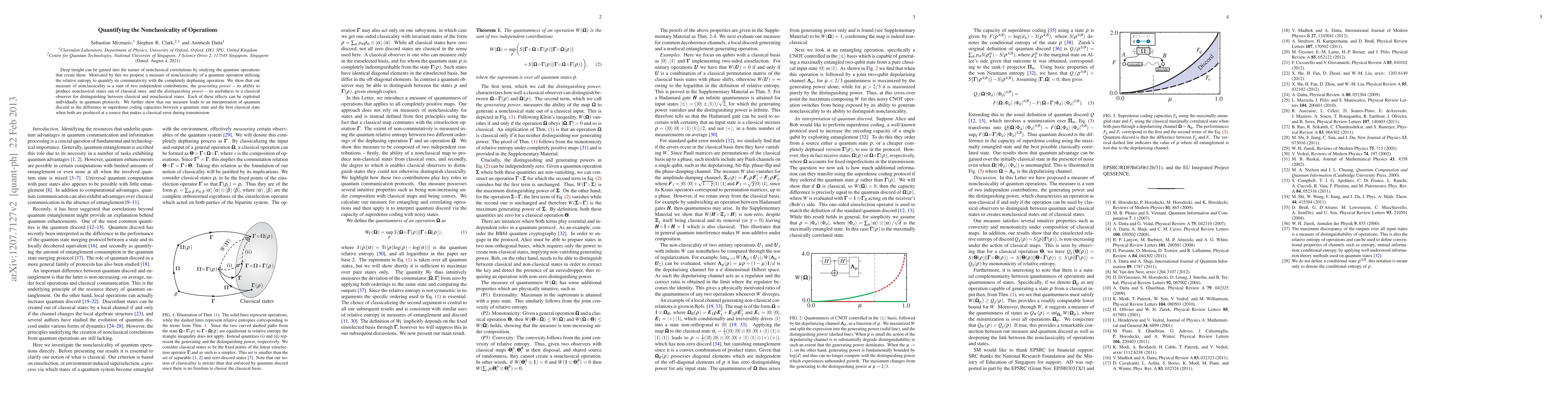 Deep insight can be gained into the nature of nonclassical correlations by studying the quantum operations that create them. Motivated by this we propose a measure of nonclassicality of a quantum operation utilizing the relative entropy to quantify its commutativity with the completely dephasing operation. We show that our measure of nonclassicality is a sum of two independent contributions, the generating power -- its ability to produce nonclassical states out of classical ones, and the distinguishing power -- its usefulness to a classical observer for distinguishing between classical and nonclassical states. Each of these effects can be exploited individually in quantum protocols. We further show that our measure leads to an interpretation of quantum discord as the difference in superdense coding capacities between a quantum state and the best classical state when both are produced at a source that makes a classical error during transmission.
