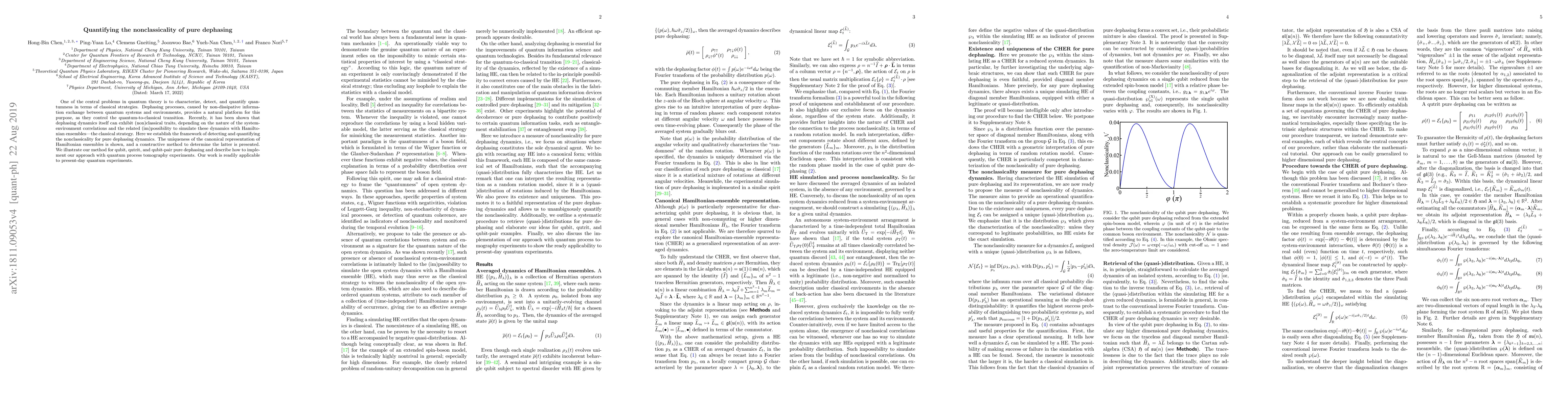 This paper develops a framework to quantify the nonclassicality of pure dephasing dynamics, establishing a method to detect and measure the quantumness of dephasing processes. It also presents a constructive approach to determine the canonical representation of Hamiltonian ensembles and applies this to qubit, qutrit, and qubit-pair systems, demonstrating its applicability to quantum process tomography experiments.