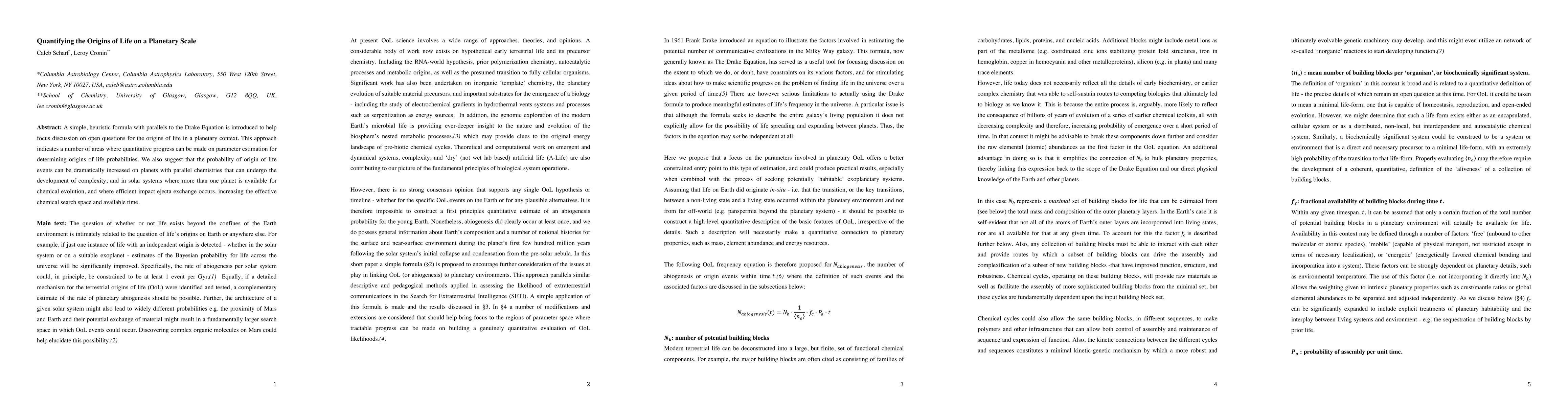 This paper introduces a heuristic formula akin to the Drake Equation to explore the origins of life on a planetary scale, suggesting areas for quantitative progress in parameter estimation. It posits that the probability of life origins increases on planets with parallel chemistries and in solar systems with multiple planets and efficient impact ejecta exchange.
