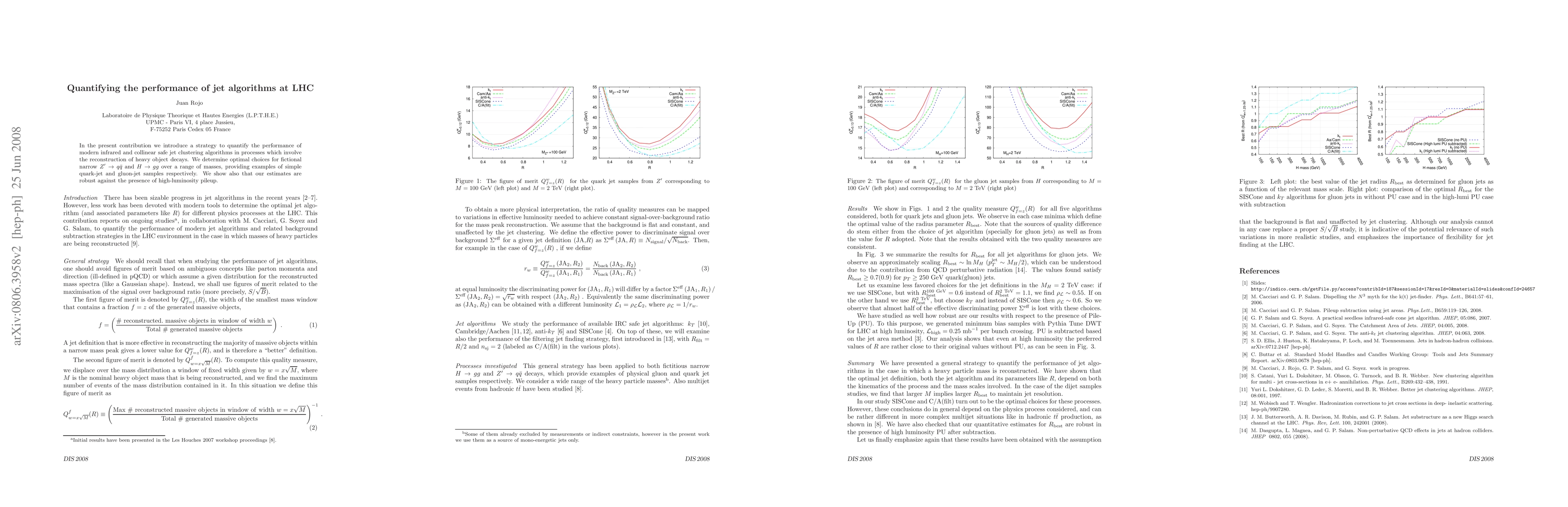 In the present contribution we introduce a strategy to quantify the performance of modern infrared and collinear safe jet clustering algorithms in processes which involve the reconstruction of heavy object decays. We determine optimal choices for fictional narrow $Z'\to q\bar{q}$ and $H\to gg$ over a range of masses, providing examples of simple quark-jet and gluon-jet samples respectively. We show also that our estimates are robust against the presence of high-luminosity pileup.