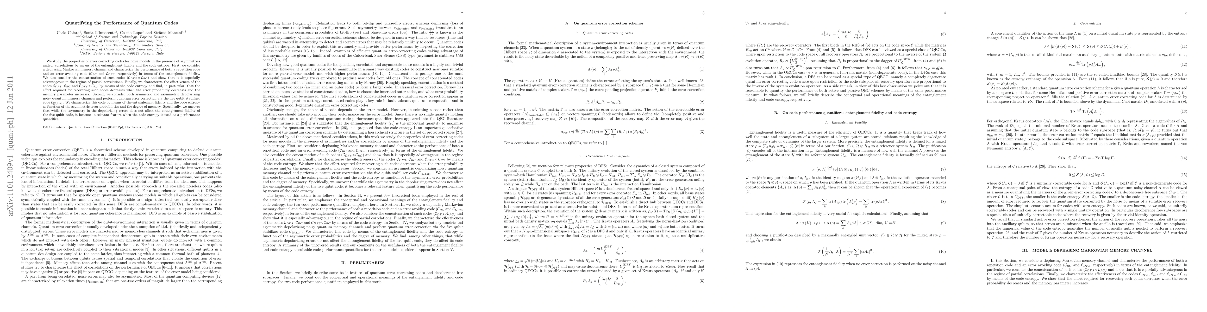 We study the properties of error correcting codes for noise models in the presence of asymmetries and/or correlations by means of the entanglement fidelity and the code entropy. First, we consider a dephasing Markovian memory channel and characterize the performance of both a repetition code and an error avoiding code in terms of the entanglement fidelity. We also consider the concatenation of such codes and show that it is especially advantageous in the regime of partial correlations. Finally, we characterize the effectiveness of the codes and their concatenation by means of the code entropy and find, in particular, that the effort required for recovering such codes decreases when the error probability decreases and the memory parameter increases. Second, we consider both symmetric and asymmetric depolarizing noisy quantum memory channels and perform quantum error correction via the five qubit stabilizer code. We characterize this code by means of the entanglement fidelity and the code entropy as function of the asymmetric error probabilities and the degree of memory. Specifically, we uncover that while the asymmetry in the depolarizing errors does not affect the entanglement fidelity of the five qubit code, it becomes a relevant feature when the code entropy is used as a performance quantifier.