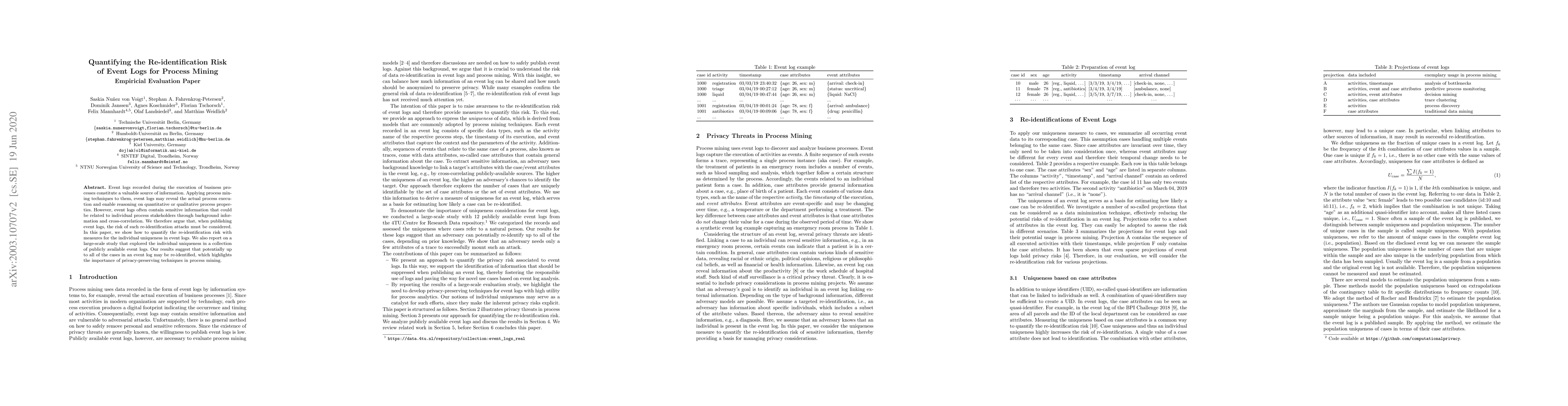 This paper quantifies the re-identification risk of event logs used in process mining, proposing measures to assess individual uniqueness. A large-scale study on publicly available logs found high re-identification potential, emphasizing the need for privacy-preserving techniques in process mining.