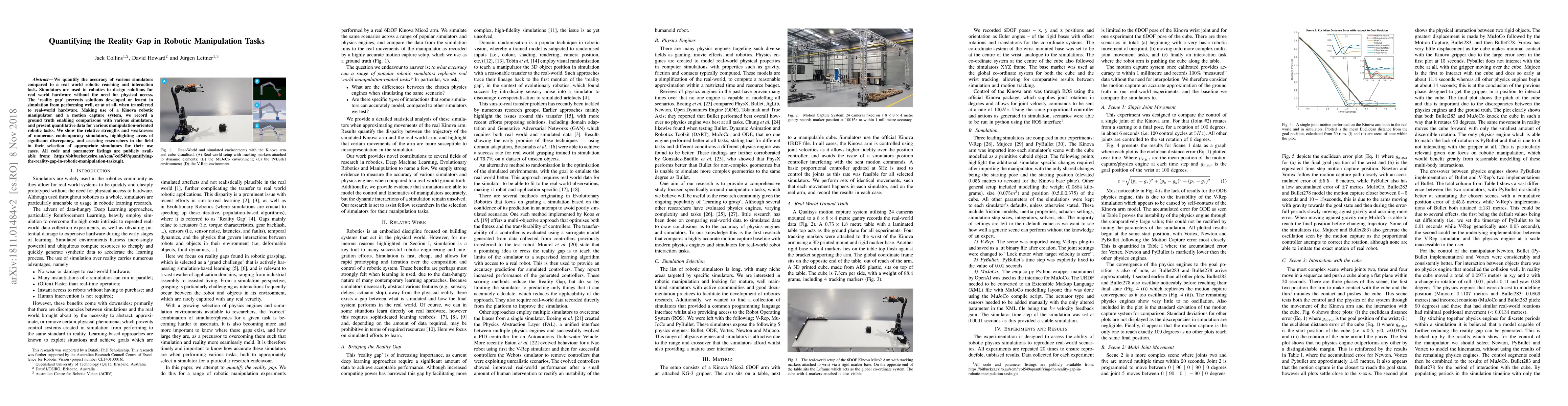 This paper quantifies the "reality gap" in robotic manipulation by comparing the performance of various simulators against real-world tasks using a Kinova manipulator and motion capture. It highlights discrepancies between simulation and reality, aiding researchers in selecting suitable simulators for their specific applications.