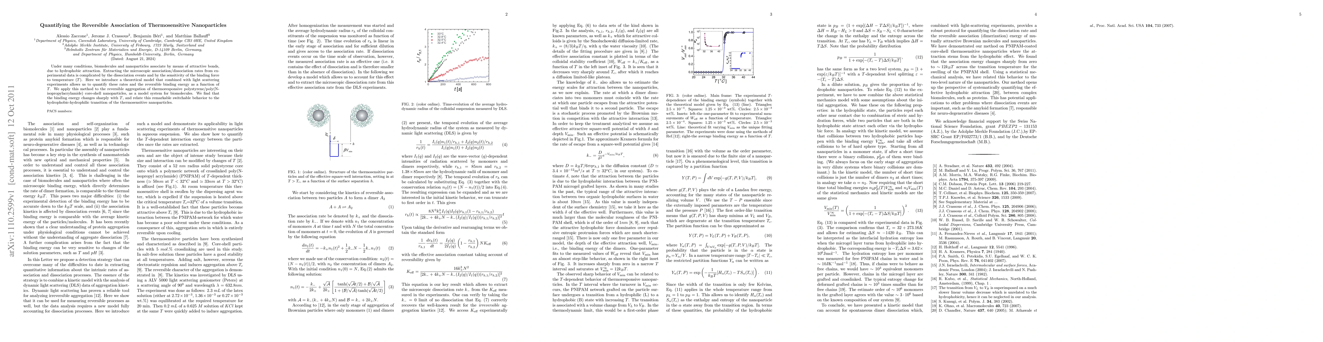 This paper presents a theoretical model combined with light-scattering experiments to quantify the reversible association rates and binding energy of thermosensitive nanoparticles as a function of temperature. The study reveals a sharp change in binding energy due to the hydrophobic-hydrophilic transition of polystyrene/poly(N-isopropylacrylamide) core-shell nanoparticles.
