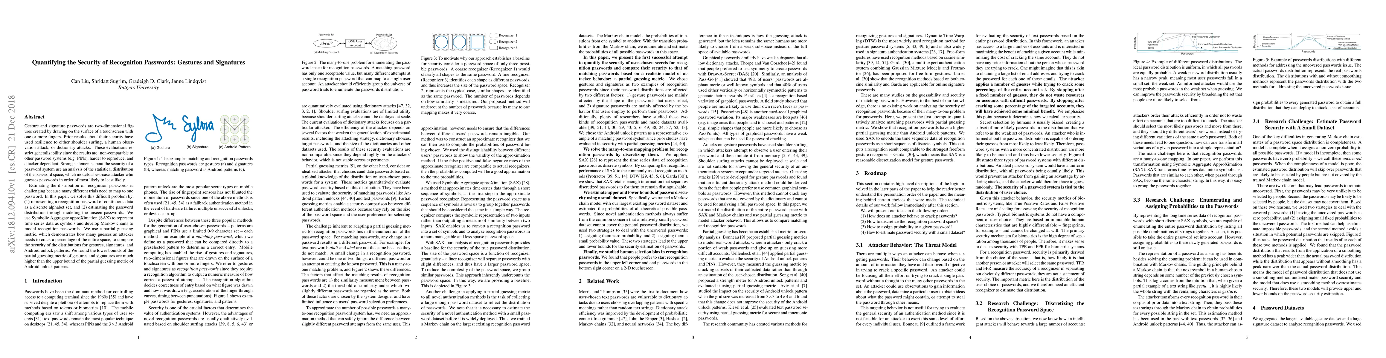 This paper quantifies the security of gesture and signature passwords by estimating the statistical distribution of their password spaces using Symbolic Aggregate approXimation (SAX) and Markov chains. The study finds that the security of gesture and signature passwords is significantly higher than that of Android unlock patterns, as indicated by the lower bounds of a partial guessing metric.