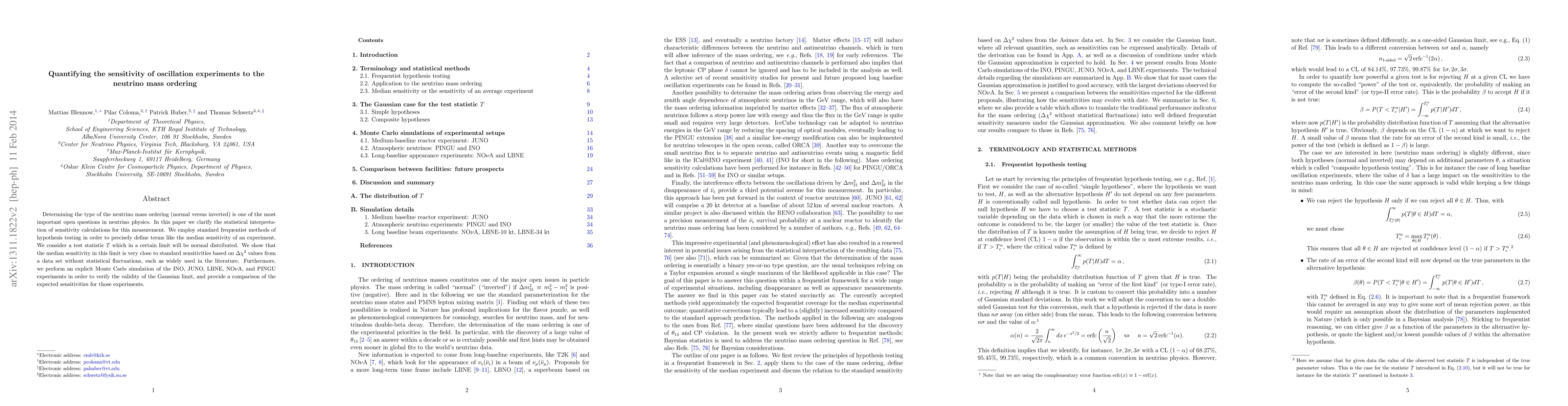 Determining the type of the neutrino mass ordering (normal versus inverted) is one of the most important open questions in neutrino physics. In this paper we clarify the statistical interpretation of sensitivity calculations for this measurement. We employ standard frequentist methods of hypothesis testing in order to precisely define terms like the median sensitivity of an experiment. We consider a test statistic $T$ which in a certain limit will be normal distributed. We show that the median sensitivity in this limit is very close to standard sensitivities based on $\Delta\chi^2$ values from a data set without statistical fluctuations, such as widely used in the literature. Furthermore, we perform an explicit Monte Carlo simulation of the INO, JUNO, LBNE, NOvA, and PINGU experiments in order to verify the validity of the Gaussian limit, and provide a comparison of the expected sensitivities for those experiments.
