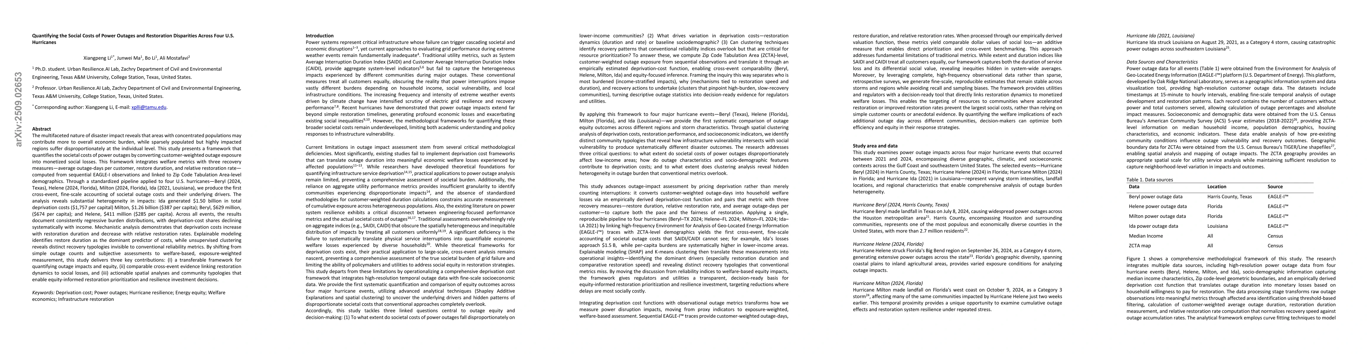 The multifaceted nature of disaster impact shows that densely populated areas contribute more to aggregate burden, while sparsely populated but heavily affected regions suffer disproportionately at the individual level. This study introduces a framework for quantifying the societal impacts of power outages by translating customer weighted outage exposure into deprivation measures, integrating welfare metrics with three recovery indicators, average outage days per customer, restoration duration, and relative restoration rate, computed from sequential EAGLE I observations and linked to Zip Code Tabulation Area demographics. Applied to four United States hurricanes, Beryl 2024 Texas, Helene 2024 Florida, Milton 2024 Florida, and Ida 2021 Louisiana, this standardized pipeline provides the first cross event, fine scale evaluation of outage impacts and their drivers. Results demonstrate regressive patterns with greater burdens in lower income areas, mechanistic analysis shows deprivation increases with longer restoration durations and decreases with faster restoration rates, explainable modeling identifies restoration duration as the dominant driver, and clustering reveals distinct recovery typologies not captured by conventional reliability metrics. This framework delivers a transferable method for assessing outage impacts and equity, comparative cross event evidence linking restoration dynamics to social outcomes, and actionable spatial analyses that support equity informed restoration planning and resilience investment.