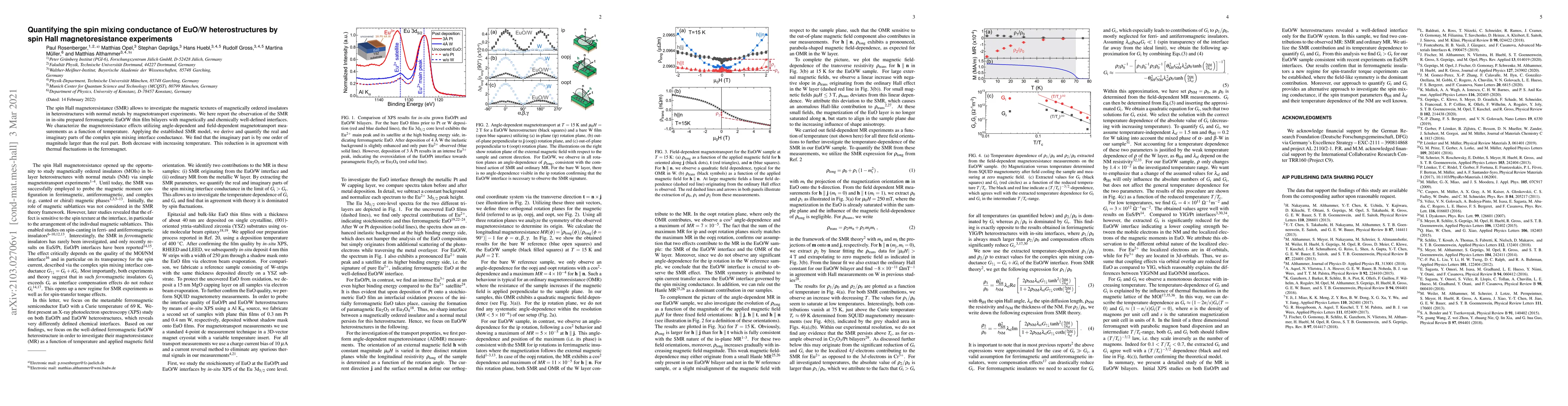 This paper reports the spin Hall magnetoresistance (SMR) in EuO/W heterostructures, revealing significant magnetoresistance effects. The study quantifies the spin mixing conductance, finding the imaginary part to be an order of magnitude larger than the real part, both decreasing with temperature due to thermal fluctuations.