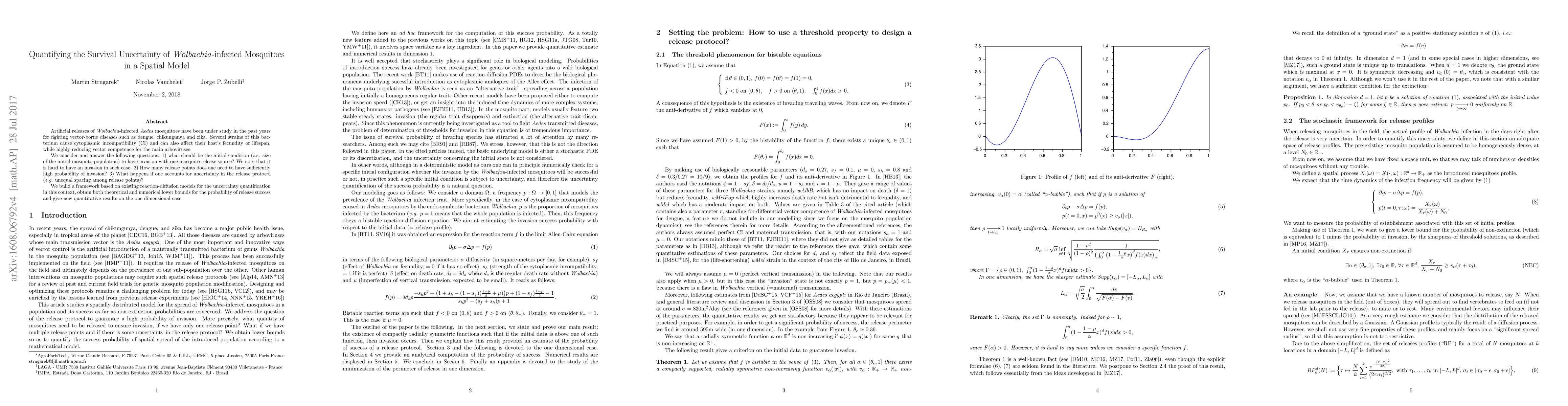Artificial releases of Wolbachia-infected Aedes mosquitoes have been under study in the past years for fighting vector-borne diseases such as dengue, chikungunya and zika. Several strains of this bacterium cause cytoplasmic incompatibility (CI) and can also affect their host's fecundity or lifespan, while highly reducing vector competence for the main arboviruses .We consider and answer the following questions: 1) what should be the initial condition (i.e. size of the initial mosquito population) to have invasion with one mosquito release source? We note that it is hard to have an invasion in such case. 2) How many release points does one need to have sufficiently high probability of invasion? 3) What happens if one accounts for uncertainty in the release protocol (e.g. unequal spacing among release points)? We build a framework based on existing reaction-diffusion models for the uncertainty quantification in this context, obtain both theoretical and numerical lower bounds for the probability of release success and give new quantitative results on the one dimensional case.