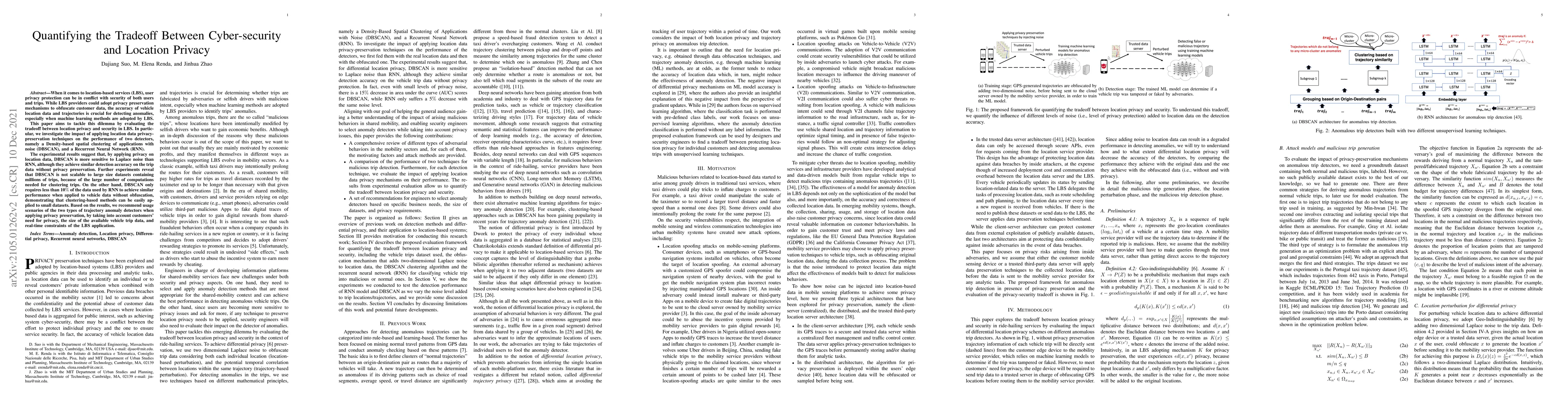When it comes to location-based services (LBS), user privacy protection can be in conflict with security of both users and trips. While LBS providers could adopt privacy preservation mechanisms to obfuscate customer data, the accuracy of vehicle location data and trajectories is crucial for detecting anomalies, especially when machine learning methods are adopted by LBS. This paper aims to tackle this dilemma by evaluating the tradeoff between location privacy and security in LBS. In particular, we investigate the impact of applying location data privacy-preservation techniques on the performance of two detectors, namely a Density-based spatial clustering of applications with noise (DBSCAN), and a Recurrent Neural Network (RNN). The experimental results suggest that, by applying privacy on location data, DBSCAN is more sensitive to Laplace noise than RNN, although they achieve similar detection accuracy on the trip data without privacy preservation. Further experiments reveal that DBSCAN is not scalable to large size datasets containing millions of trips, because of the large number of computations needed for clustering trips. On the other hand, DBSCAN only requires less than 10 percent of the data used by RNN to achieve similar performance when applied to vehicle data without obfuscation, demonstrating that clustering-based methods can be easily applied to small datasets. Based on the results, we recommend usage scenarios of the two types of trajectory anomaly detectors when applying privacy preservation, by taking into account customers' need for privacy, the size of the available vehicle trip data, and real-time constraints of the LBS application.