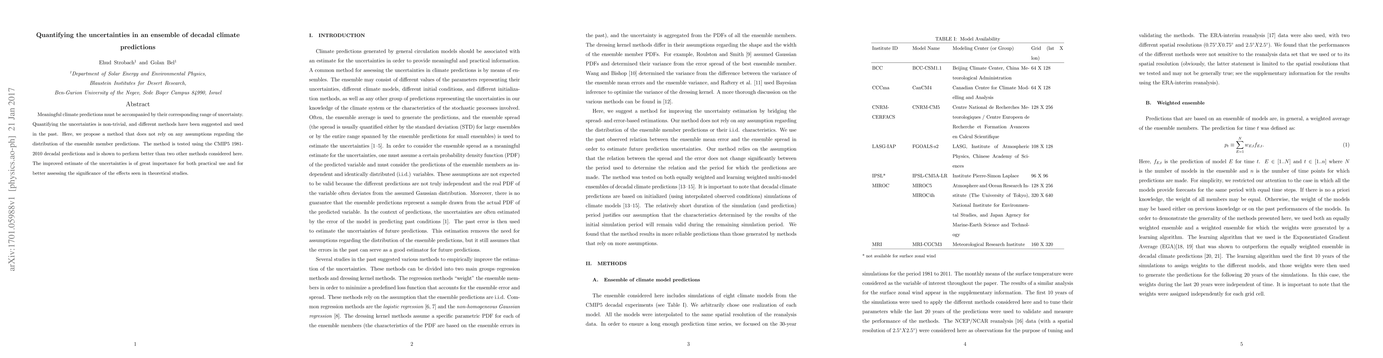 Meaningful climate predictions must be accompanied by their corresponding range of uncertainty. Quantifying the uncertainties is non-trivial, and different methods have been suggested and used in the past. Here, we propose a method that does not rely on any assumptions regarding the distribution of the ensemble member predictions. The method is tested using the CMIP5 1981-2010 decadal predictions and is shown to perform better than two other methods considered here. The improved estimate of the uncertainties is of great importance for both practical use and for better assessing the significance of the effects seen in theoretical studies.