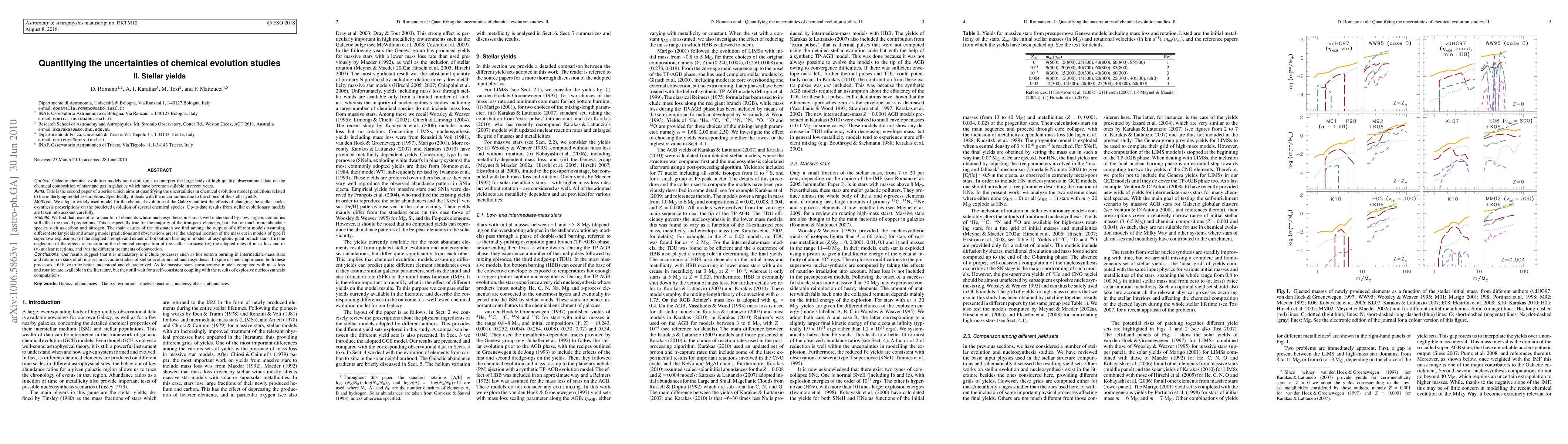 This paper quantifies uncertainties in chemical evolution models due to stellar yields, finding significant discrepancies in predictions for iron-peak elements and abundant species like carbon and nitrogen. Key sources of uncertainty include mass cut location in supernovae, hot bottom burning, rotation effects, mass loss rates, nuclear reaction rates, and convection treatments.