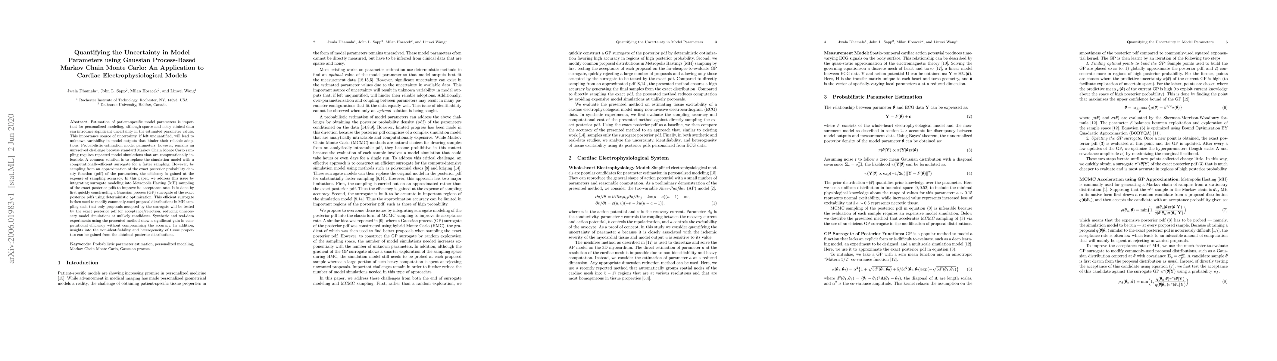 Estimation of patient-specific model parameters is important for personalized modeling, although sparse and noisy clinical data can introduce significant uncertainty in the estimated parameter values. This importance source of uncertainty, if left unquantified, will lead to unknown variability in model outputs that hinder their reliable adoptions. Probabilistic estimation model parameters, however, remains an unresolved challenge because standard Markov Chain Monte Carlo sampling requires repeated model simulations that are computationally infeasible. A common solution is to replace the simulation model with a computationally-efficient surrogate for a faster sampling. However, by sampling from an approximation of the exact posterior probability density function (pdf) of the parameters, the efficiency is gained at the expense of sampling accuracy. In this paper, we address this issue by integrating surrogate modeling into Metropolis Hasting (MH) sampling of the exact posterior pdfs to improve its acceptance rate. It is done by first quickly constructing a Gaussian process (GP) surrogate of the exact posterior pdfs using deterministic optimization. This efficient surrogate is then used to modify commonly-used proposal distributions in MH sampling such that only proposals accepted by the surrogate will be tested by the exact posterior pdf for acceptance/rejection, reducing unnecessary model simulations at unlikely candidates. Synthetic and real-data experiments using the presented method show a significant gain in computational efficiency without compromising the accuracy. In addition, insights into the non-identifiability and heterogeneity of tissue properties can be gained from the obtained posterior distributions.