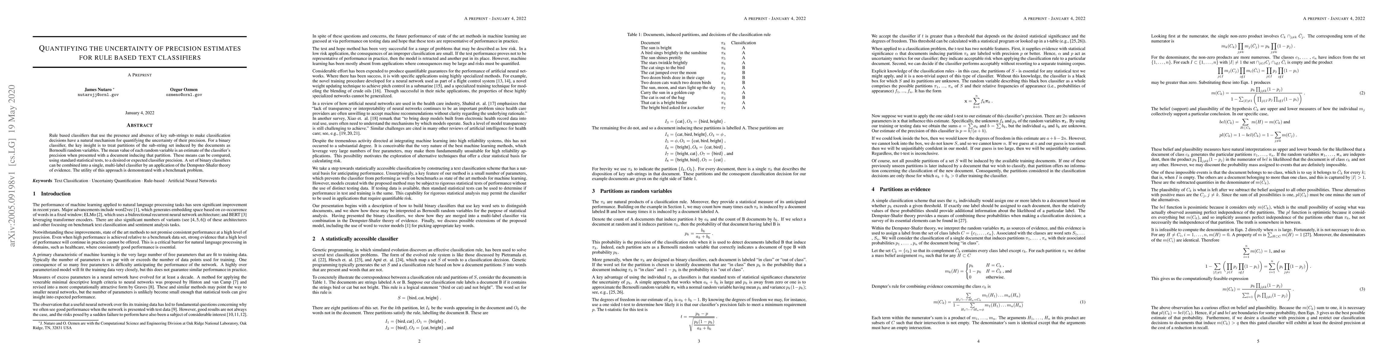 This paper introduces a method to quantify uncertainty in rule-based text classifiers using Bernoulli random variables and Dempster-Shafer theory, allowing for comparison of classifier precision and combining multiple classifiers into a single multi-label model.