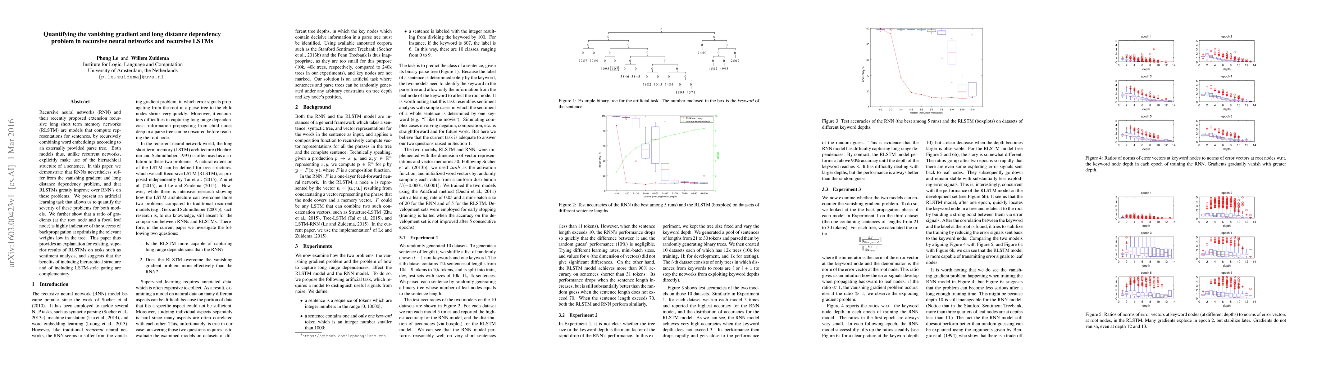 This paper investigates the vanishing gradient and long distance dependency issues in recursive neural networks (RNN) and recursive long short term memory networks (RLSTM), demonstrating that RLSTMs outperform RNNs. It introduces an artificial learning task to quantify these problems and shows that a gradient ratio is indicative of backpropagation effectiveness.