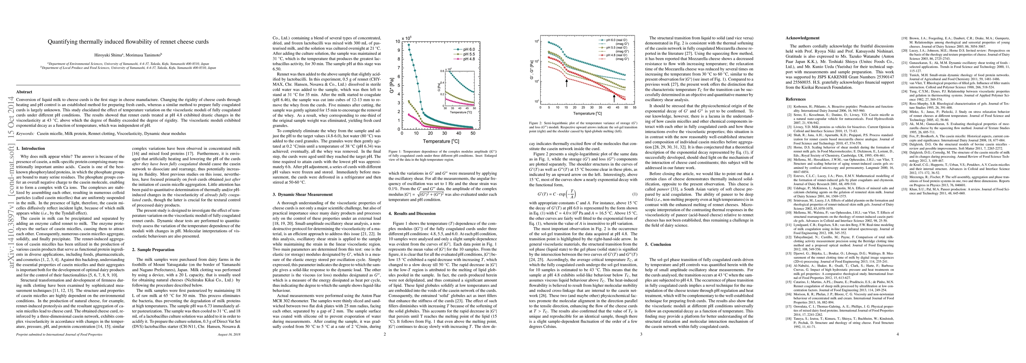 Conversion of liquid milk to cheese curds is the first stage in cheese manufacture. Changing the rigidity of cheese curds through heating and pH control is an established method for preparing fresh curds, whereas a similar method to prepare fully coagulated curds is largely unknown. This study elucidated the effect of temperature variation on the viscoelastic moduli of fully coagulated curds under different pH conditions. The results showed that rennet curds treated at pH 4.8 exhibited drastic changes in the viscoelasticity at 43 degrees C, above which the degree of fluidity exceeded the degree of rigidity. The viscoelastic moduli exhibited exponential decay as a function of temperature, which was independent of pH.