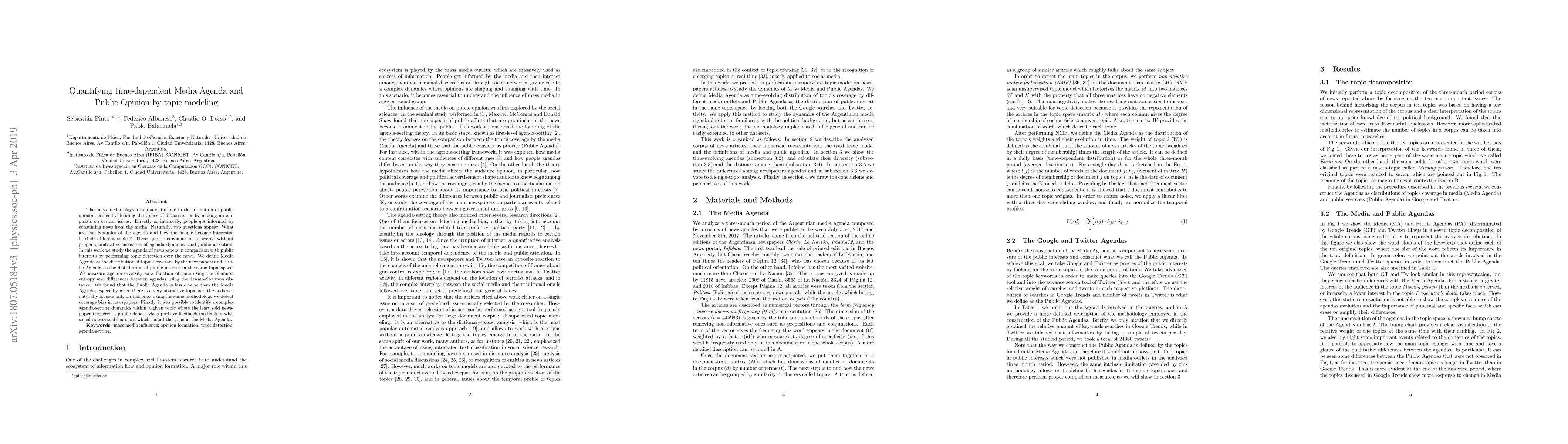 This research quantifies the dynamics of media agenda and public opinion through topic modeling, revealing that public interest is less diverse than media coverage, especially when a single topic dominates. The study identifies coverage bias and a feedback mechanism where less popular newspapers initiate public debates that influence media focus.