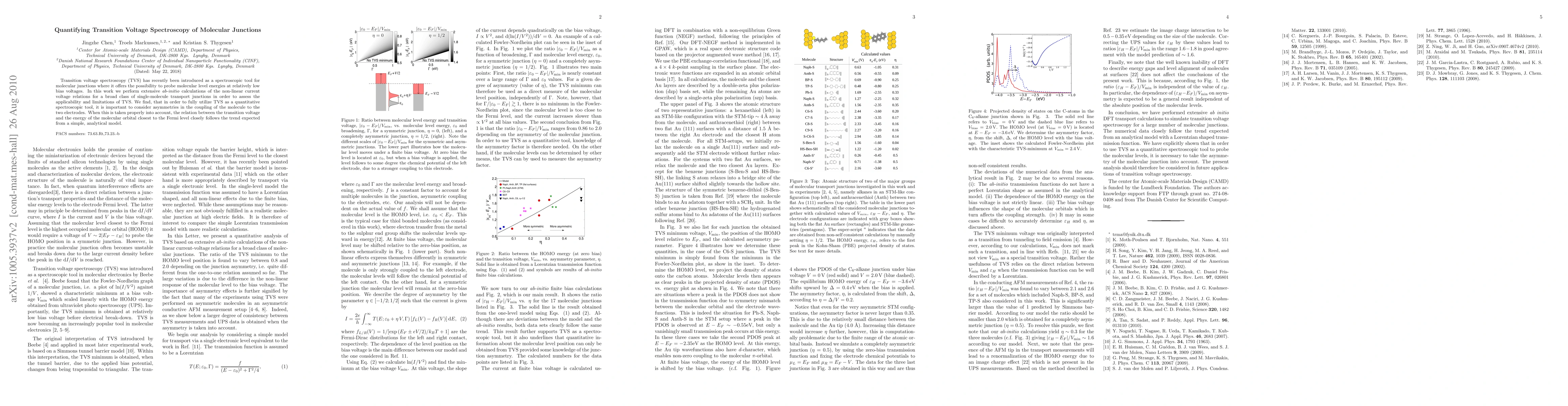 This paper investigates the applicability of transition voltage spectroscopy (TVS) in molecular junctions through extensive ab-initio calculations. It finds that asymmetries in the molecule-electrode coupling significantly affect TVS results, but when properly accounted for, TVS can quantitatively probe molecular energy levels.