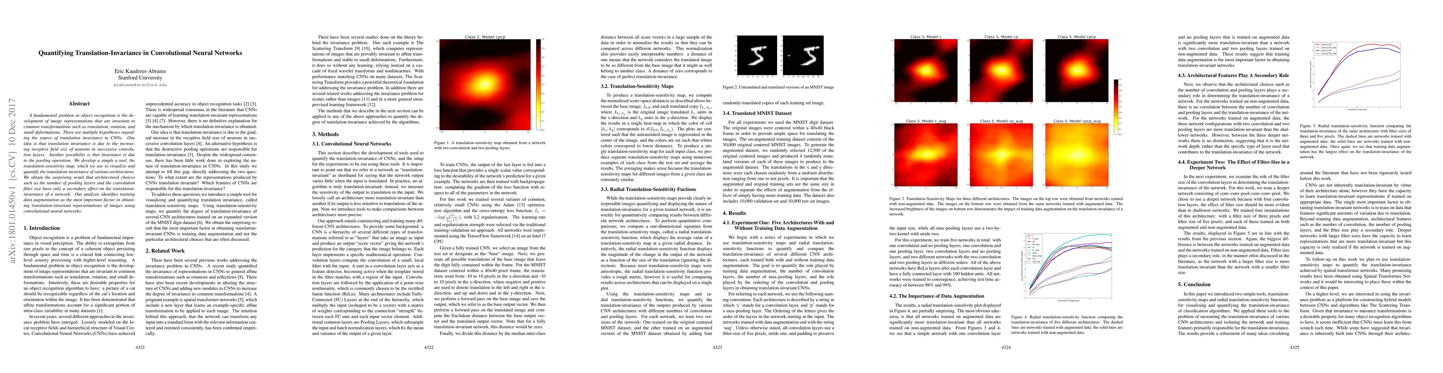 A fundamental problem in object recognition is the development of image representations that are invariant to common transformations such as translation, rotation, and small deformations. There are multiple hypotheses regarding the source of translation invariance in CNNs. One idea is that translation invariance is due to the increasing receptive field size of neurons in successive convolution layers. Another possibility is that invariance is due to the pooling operation. We develop a simple a tool, the translation-sensitivity map, which we use to visualize and quantify the translation-invariance of various architectures. We obtain the surprising result that architectural choices such as the number of pooling layers and the convolution filter size have only a secondary effect on the translation-invariance of a network. Our analysis identifies training data augmentation as the most important factor in obtaining translation-invariant representations of images using convolutional neural networks.