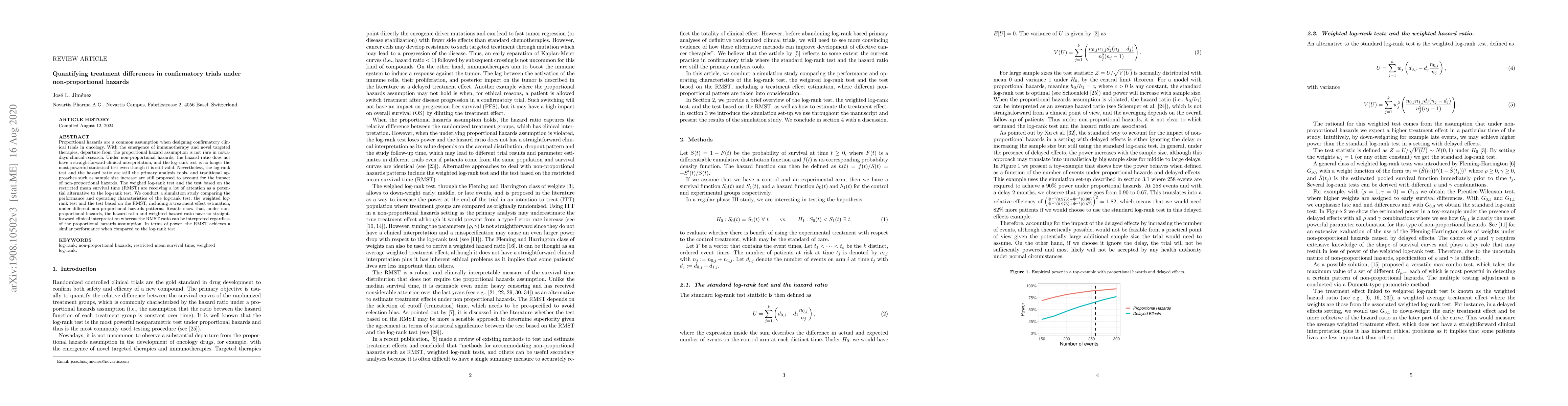 Proportional hazards are a common assumption when designing confirmatory clinical trials in oncology. With the emergence of immunotherapy and novel targeted therapies, departure from the proportional hazard assumption is not rare in nowadays clinical research. Under non-proportional hazards, the hazard ratio does not have a straightforward clinical interpretation, and the log-rank test is no longer the most powerful statistical test even though it is still valid. Nevertheless, the log-rank test and the hazard ratio are still the primary analysis tools, and traditional approaches such as sample size increase are still proposed to account for the impact of non-proportional hazards. The weighed log-rank test and the test based on the restricted mean survival time (RMST) are receiving a lot of attention as a potential alternative to the log-rank test. We conduct a simulation study comparing the performance and operating characteristics of the log-rank test, the weighted log-rank test and the test based on the RMST, including a treatment effect estimation, under different non-proportional hazards patterns. Results show that, under non-proportional hazards, the hazard ratio and weighted hazard ratio have no straightforward clinical interpretation whereas the RMST ratio can be interpreted regardless of the proportional hazards assumption. In terms of power, the RMST achieves a similar performance when compared to the log-rank test.