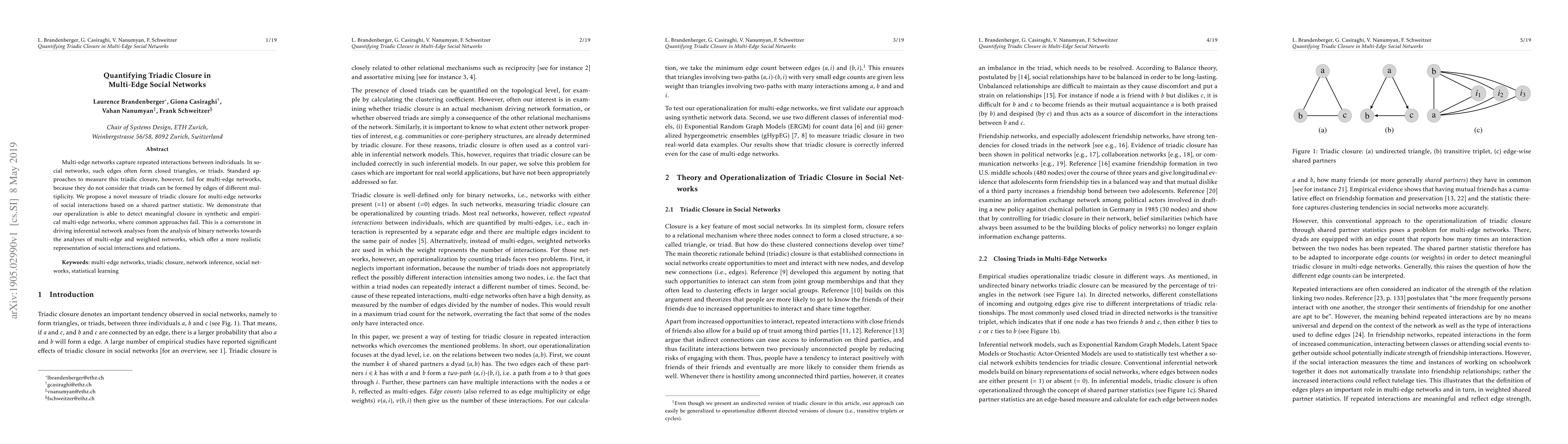 This paper proposes a new measure for quantifying triadic closure in multi-edge social networks, addressing the limitations of existing methods that do not account for edge multiplicity. The proposed method, based on a shared partner statistic, successfully detects meaningful closure in both synthetic and empirical multi-edge networks, advancing the analysis of more realistic social interaction data.