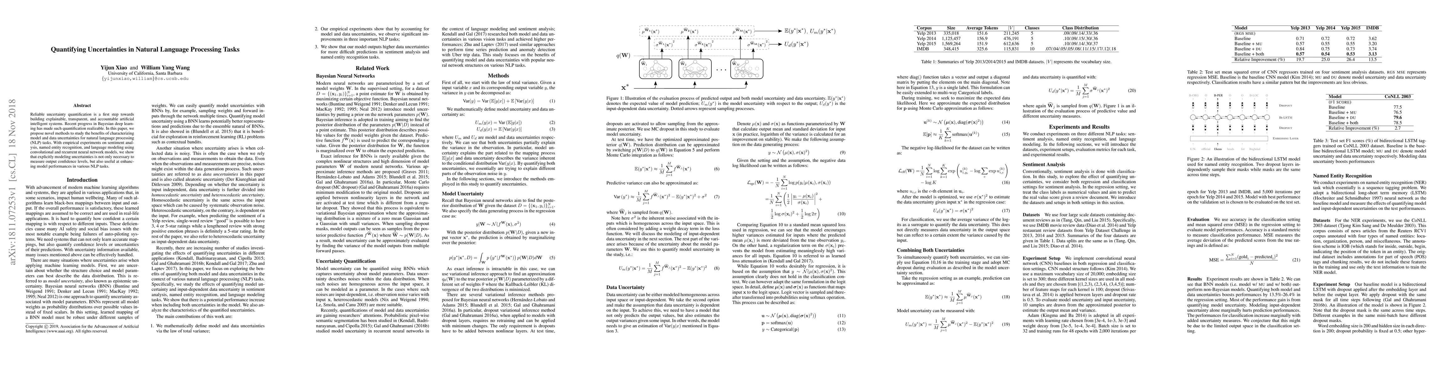 This paper proposes new methods to quantify uncertainties in natural language processing tasks, leveraging Bayesian deep learning. Empirical results from sentiment analysis, named entity recognition, and language modeling demonstrate that modeling uncertainties improves both confidence measures and model performance.