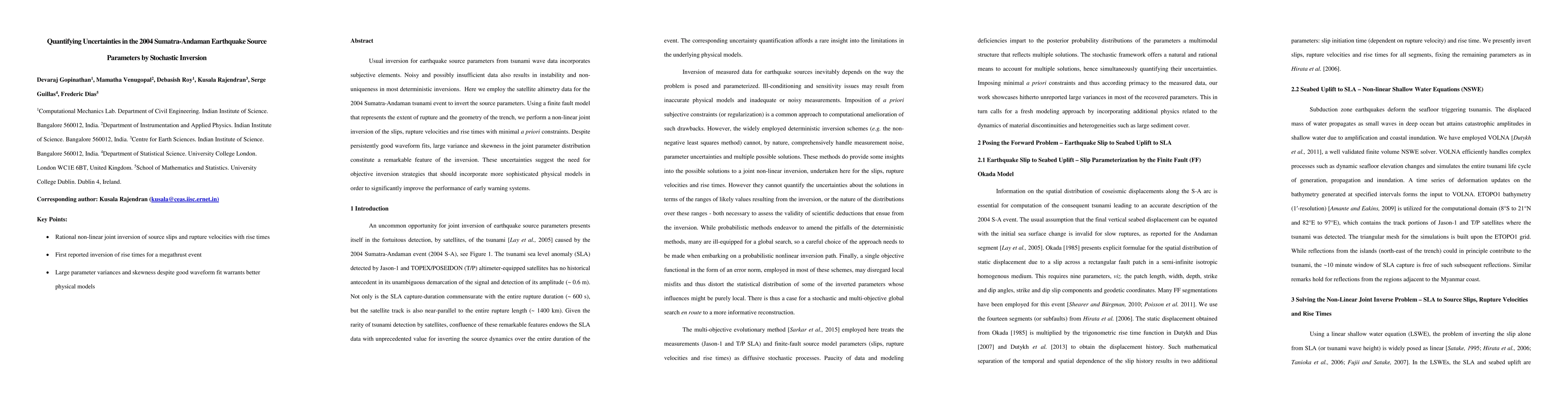 This paper quantifies uncertainties in the source parameters of the 2004 Sumatra-Andaman earthquake using satellite altimetry data and stochastic inversion. Despite achieving good waveform fits, the inversion reveals significant variance and skewness, highlighting the necessity for advanced physical models to enhance early warning systems.