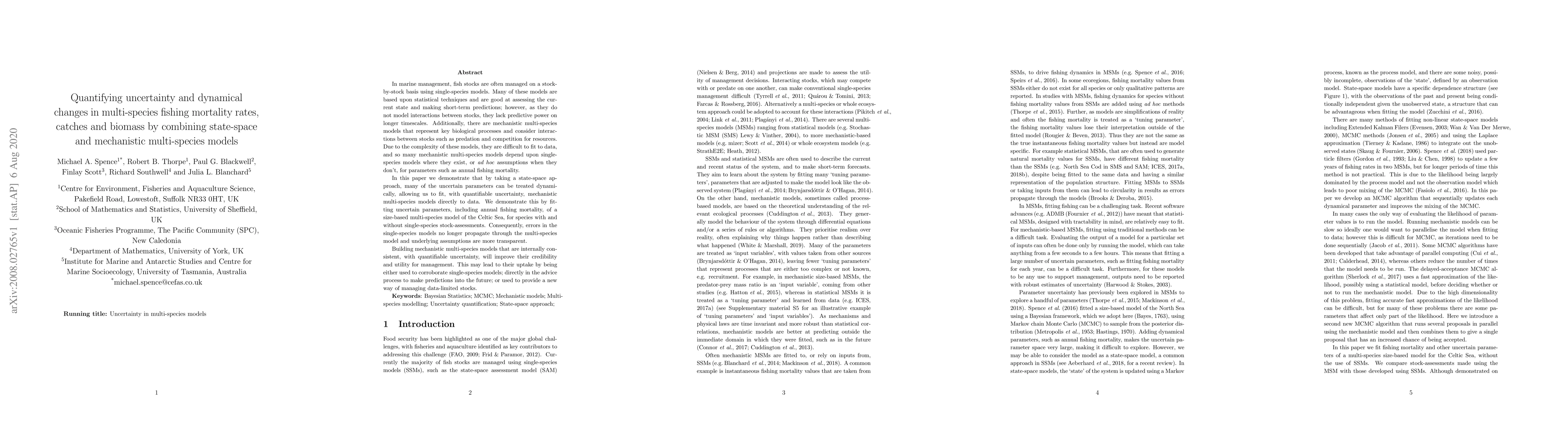 This paper combines state-space and mechanistic multi-species models to quantify uncertainties and track changes in fishing mortality rates, catches, and biomass in marine ecosystems. By fitting uncertain parameters directly to data, it aims to improve the credibility and utility of multi-species models for better management and predictions.