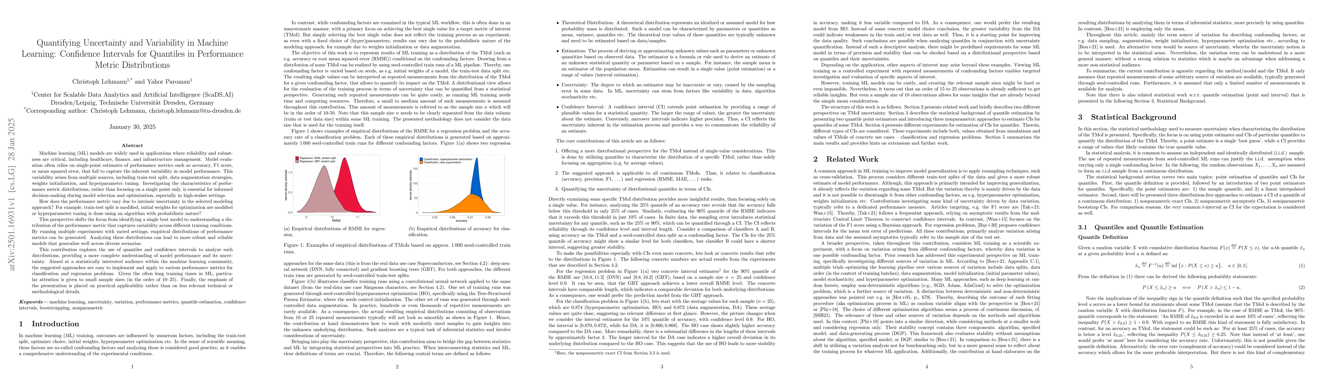 This paper proposes using quantiles and confidence intervals to analyze distributions of performance metrics in machine learning, aiming to capture variability from factors like train-test splits and hyperparameter tuning. It emphasizes the importance of understanding performance distributions for robust model selection, especially under small sample sizes.