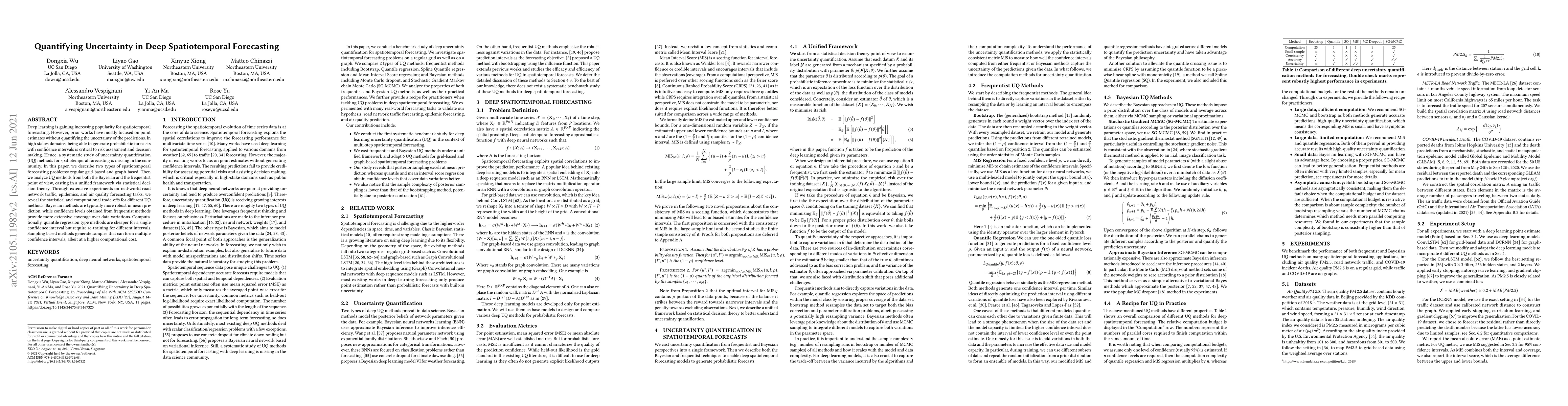 This research paper explores uncertainty quantification (UQ) methods for deep spatiotemporal forecasting, crucial for high-stakes decision-making. It analyzes Bayesian and frequentist UQ approaches via statistical decision theory, revealing trade-offs: Bayesian methods excel in mean prediction robustness, while frequentist methods offer broader coverage; computationally, some methods are cheaper for single intervals but require re-training, others generate multiple intervals at higher cost.