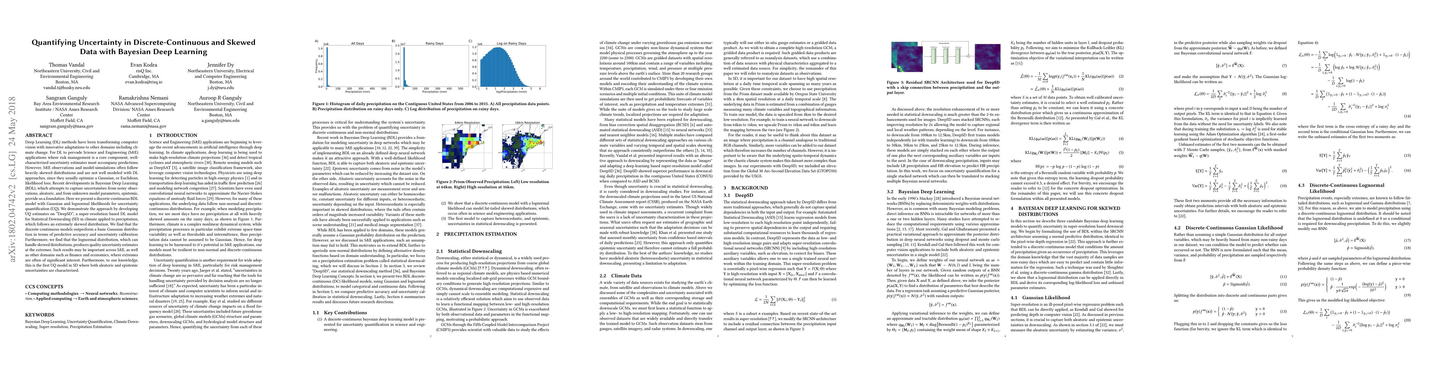 Deep Learning (DL) methods have been transforming computer vision with innovative adaptations to other domains including climate change. For DL to pervade Science and Engineering (S&E) applications where risk management is a core component, well-characterized uncertainty estimates must accompany predictions. However, S&E observations and model-simulations often follow heavily skewed distributions and are not well modeled with DL approaches, since they usually optimize a Gaussian, or Euclidean, likelihood loss. Recent developments in Bayesian Deep Learning (BDL), which attempts to capture uncertainties from noisy observations, aleatoric, and from unknown model parameters, epistemic, provide us a foundation. Here we present a discrete-continuous BDL model with Gaussian and lognormal likelihoods for uncertainty quantification (UQ). We demonstrate the approach by developing UQ estimates on `DeepSD', a super-resolution based DL model for Statistical Downscaling (SD) in climate applied to precipitation, which follows an extremely skewed distribution. We find that the discrete-continuous models outperform a basic Gaussian distribution in terms of predictive accuracy and uncertainty calibration. Furthermore, we find that the lognormal distribution, which can handle skewed distributions, produces quality uncertainty estimates at the extremes. Such results may be important across S&E, as well as other domains such as finance and economics, where extremes are often of significant interest. Furthermore, to our knowledge, this is the first UQ model in SD where both aleatoric and epistemic uncertainties are characterized.