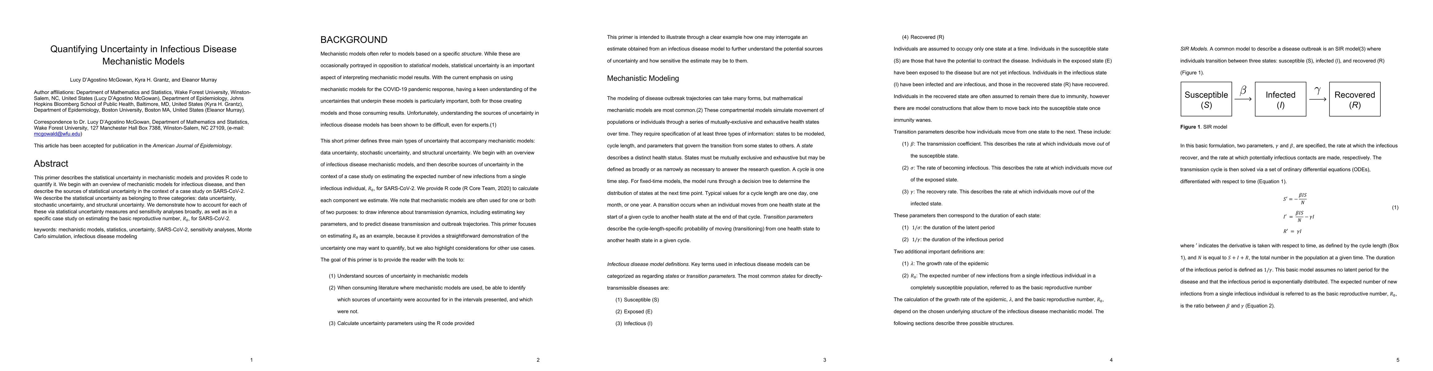 This primer describes the statistical uncertainty in mechanistic models and provides R code to quantify it. We begin with an overview of mechanistic models for infectious disease, and then describe the sources of statistical uncertainty in the context of a case study on SARS-CoV-2. We describe the statistical uncertainty as belonging to three categories: data uncertainty, stochastic uncertainty, and structural uncertainty. We demonstrate how to account for each of these via statistical uncertainty measures and sensitivity analyses broadly, as well as in a specific case study on estimating the basic reproductive number, $R_0$, for SARS-CoV-2.