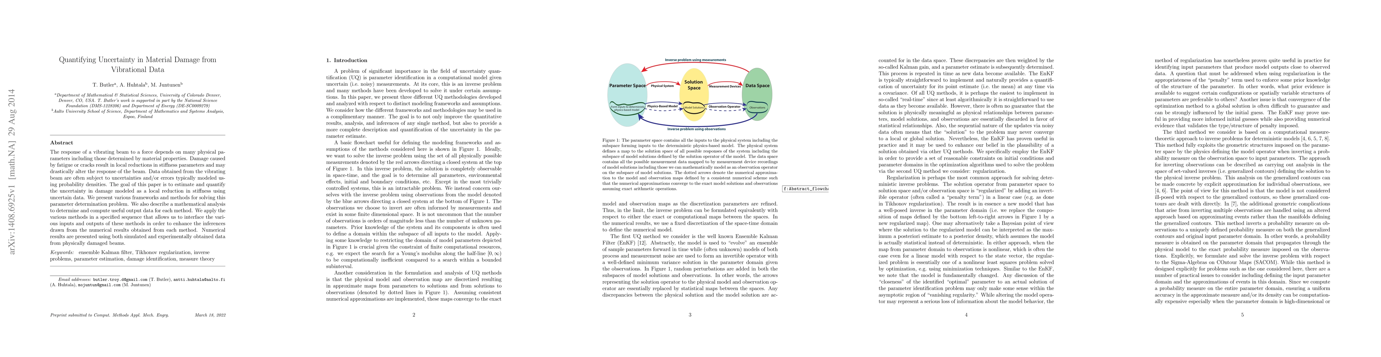 The response of a vibrating beam to a force depends on many physical parameters including those determined by material properties. Damage caused by fatigue or cracks result in local reductions in stiffness parameters and may drastically alter the response of the beam. Data obtained from the vibrating beam are often subject to uncertainties and/or errors typically modeled using probability densities. The goal of this paper is to estimate and quantify the uncertainty in damage modeled as a local reduction in stiffness using uncertain data. We present various frameworks and methods for solving this parameter determination problem. We also describe a mathematical analysis to determine and compute useful output data for each method. We apply the various methods in a specified sequence that allows us to interface the various inputs and outputs of these methods in order to enhance the inferences drawn from the numerical results obtained from each method. Numerical results are presented using both simulated and experimentally obtained data from physically damaged beams.