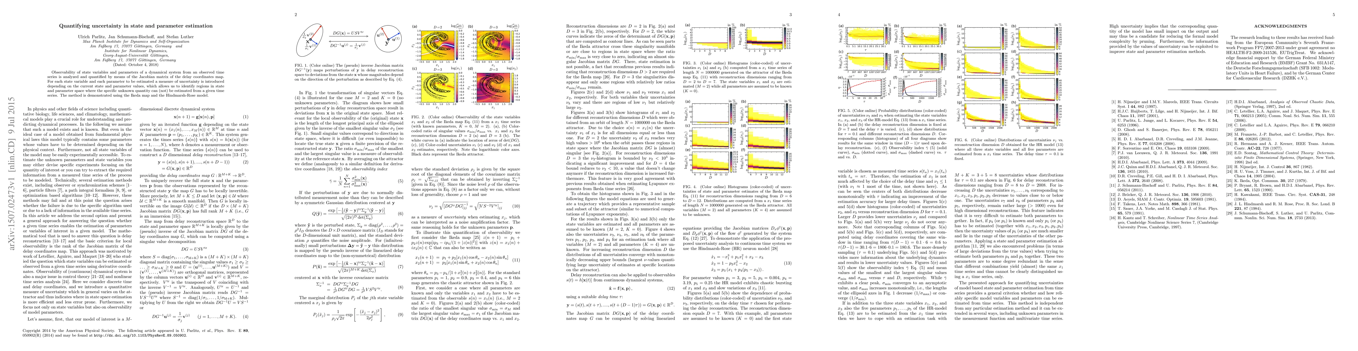 This paper introduces a method to quantify uncertainty in state and parameter estimation from observed time series data, using the Jacobian matrix of a delay coordinates map. It allows for identifying regions in state and parameter space where specific unknown quantities can be estimated.