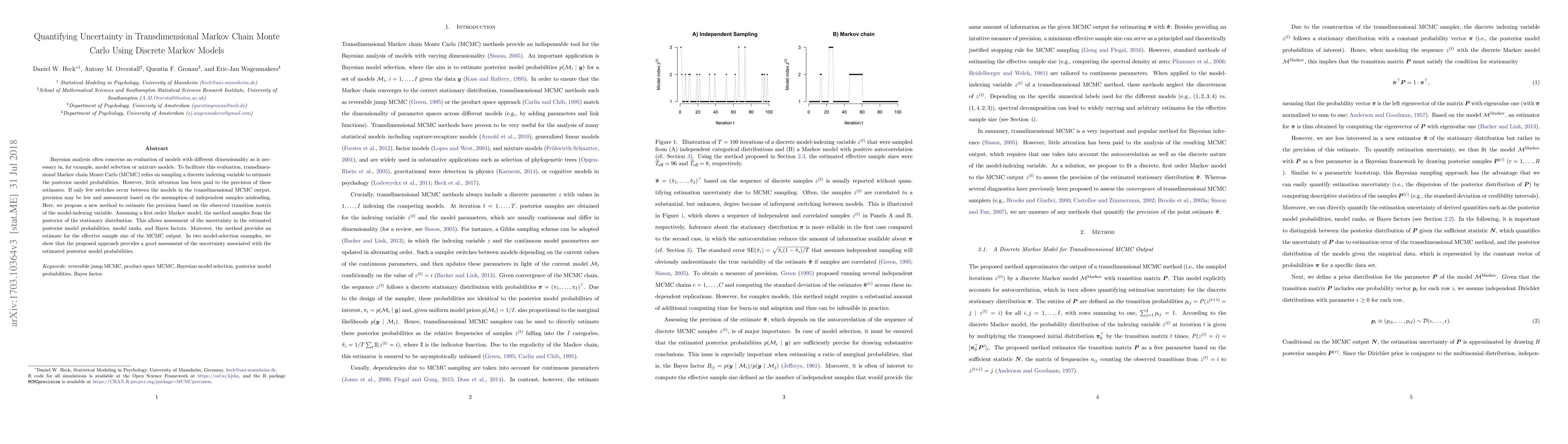 Bayesian analysis often concerns an evaluation of models with different dimensionality as is necessary in, for example, model selection or mixture models. To facilitate this evaluation, transdimensional Markov chain Monte Carlo (MCMC) relies on sampling a discrete indexing variable to estimate the posterior model probabilities. However, little attention has been paid to the precision of these estimates. If only few switches occur between the models in the transdimensional MCMC output, precision may be low and assessment based on the assumption of independent samples misleading. Here, we propose a new method to estimate the precision based on the observed transition matrix of the model-indexing variable. Assuming a first order Markov model, the method samples from the posterior of the stationary distribution. This allows assessment of the uncertainty in the estimated posterior model probabilities, model ranks, and Bayes factors. Moreover, the method provides an estimate for the effective sample size of the MCMC output. In two model-selection examples, we show that the proposed approach provides a good assessment of the uncertainty associated with the estimated posterior model probabilities.