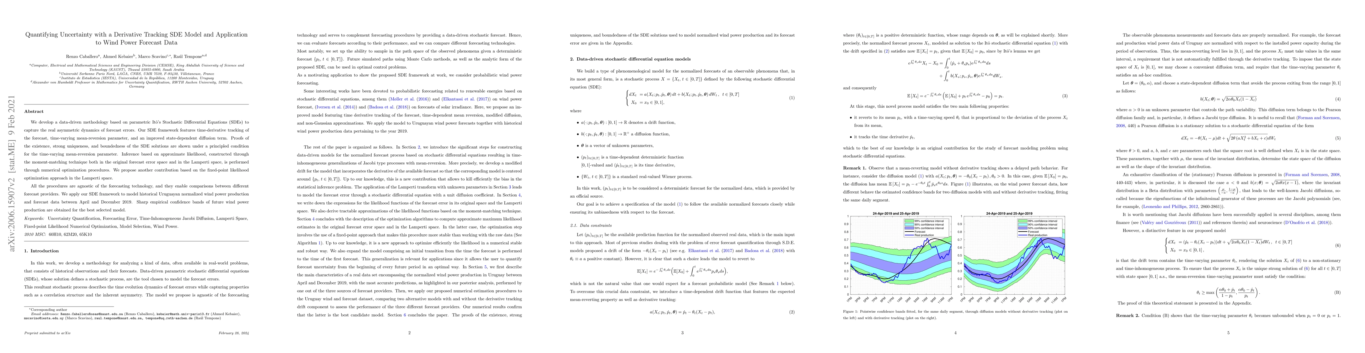 This paper develops a parametric SDE model to quantify forecast uncertainty in wind power data, incorporating time-derivative tracking and time-varying parameters. The model is applied to Uruguayan wind power data, yielding sharp empirical confidence bands for future production.