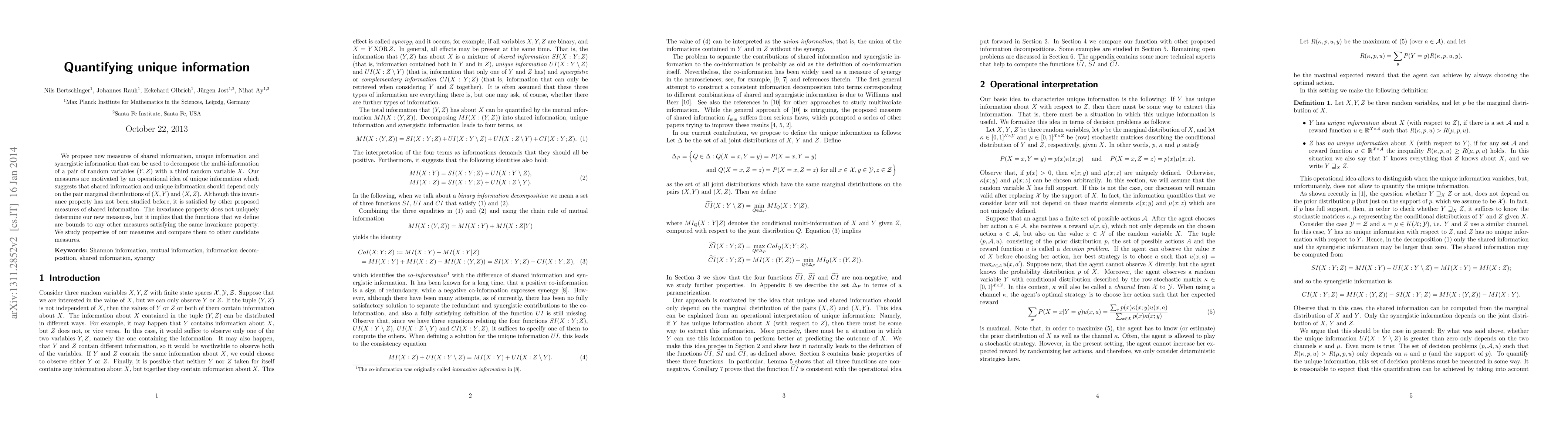 Researchers propose new measures of shared information and unique information to decompose multi-information between three random variables. Their measures satisfy an invariance property that ensures consistency across different pairs of variables.