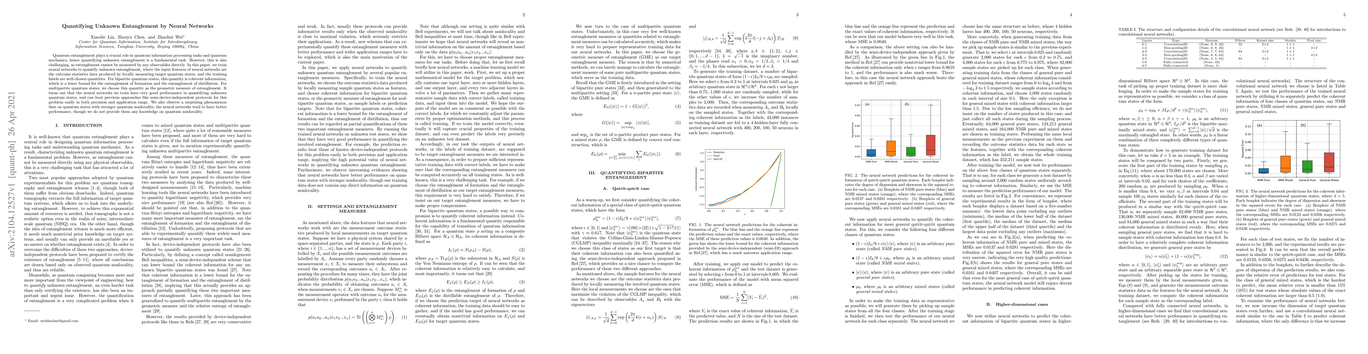 Quantum entanglement plays a crucial role in quantum information processing tasks and quantum mechanics, hence quantifying unknown entanglement is a fundamental task. However, this is also challenging, as entanglement cannot be measured by any observables directly. In this paper, we train neural networks to quantify unknown entanglement, where the input features of neural networks are the outcome statistics data produced by locally measuring target quantum states, and the training labels are well-chosen quantities. For bipartite quantum states, this quantity is coherent information, which is a lower bound for the entanglement of formation and the entanglement of distillation. For multipartite quantum states, we choose this quantity as the geometric measure of entanglement. It turns out that the neural networks we train have very good performance in quantifying unknown quantum states, and can beat previous approaches like semi-device-independent protocols for this problem easily in both precision and application range. We also observe a surprising phenomenon that on quantum states with stronger quantum nonlocality, the neural networks tend to have better performance, though we do not provide them any knowledge on quantum nonlocality.