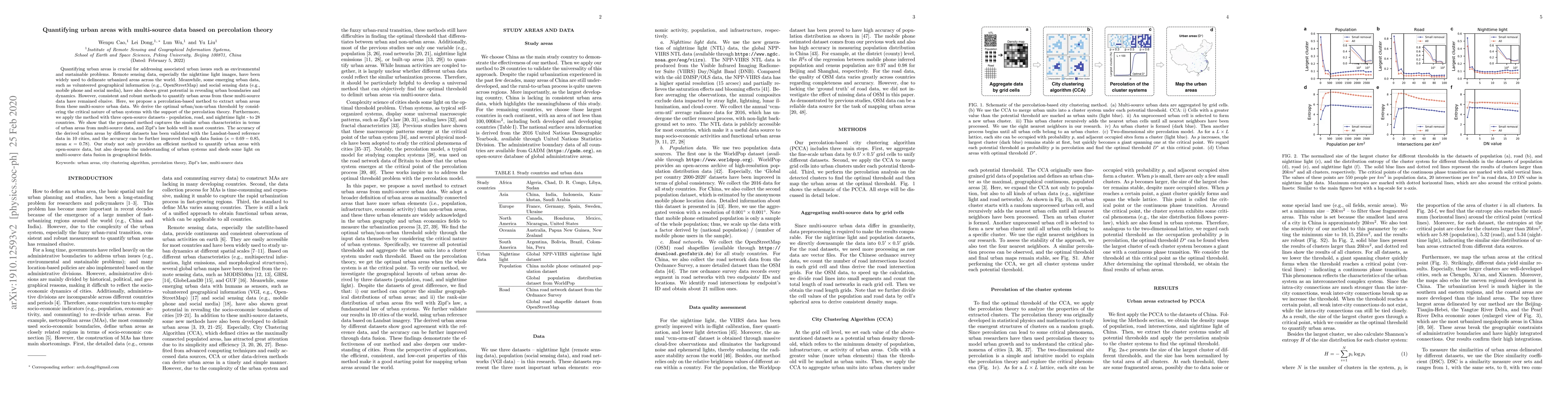 This paper proposes a percolation-based method to quantify urban areas using multi-source data, including remote sensing, volunteered geographical information, and social sensing data. The method determines optimal thresholds using percolation theory and demonstrates its effectiveness across 28 countries, achieving high accuracy validated by Landsat data.