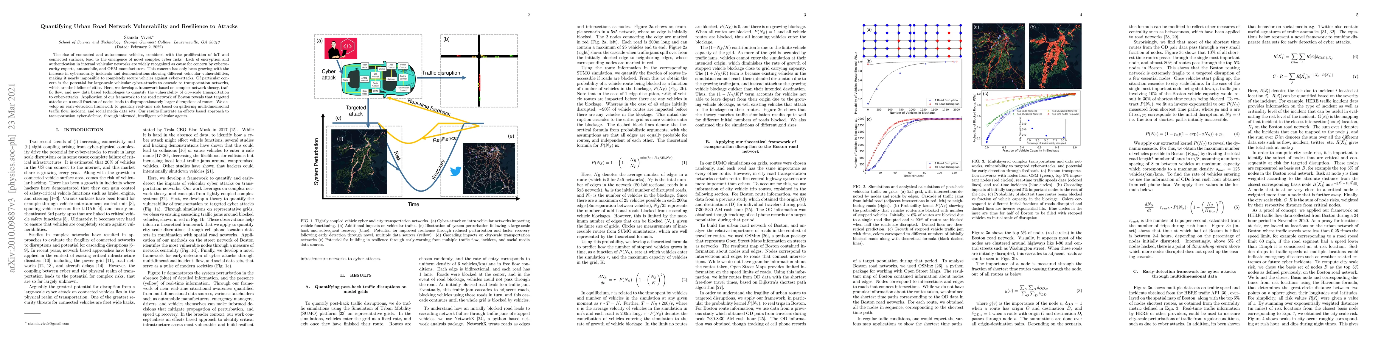 The rise of connected and autonomous vehicles, combined with the proliferation of IoT and connected surfaces, lead to the emergence of novel complex cyber risks. Lack of encryption and authentication in internal vehicular networks are widely recognized as cause for concern by cybersecurity experts, automobile, and OEM manufacturers. This concern has only been growing with the increase in cybersecurity incidents and demonstrations showing different vehicular vulnerabilities, making it nearly impossible to completely secure vehicles against cyber-attacks. Of particular concern is the potential for large-scale vehicular cyber-attacks to cascade to transportation networks, which are the lifeline of cities. Here, we develop a framework based on complex network theory, traffic flow, and new data based technologies to quantify the vulnerability of city-scale transportation to cyber-attacks. Application of our framework to the road network of Boston reveals that targeted attacks on a small fraction of nodes leads to disproportionately larger disruptions of routes. We develop an early-detection framework to quantify real-time risk based on gathering multidimensional traffic flow, incident, and social media data sets. Our results illustrate an effects based approach to transportation cyber-defense, through informed, intelligent vehicular agents.