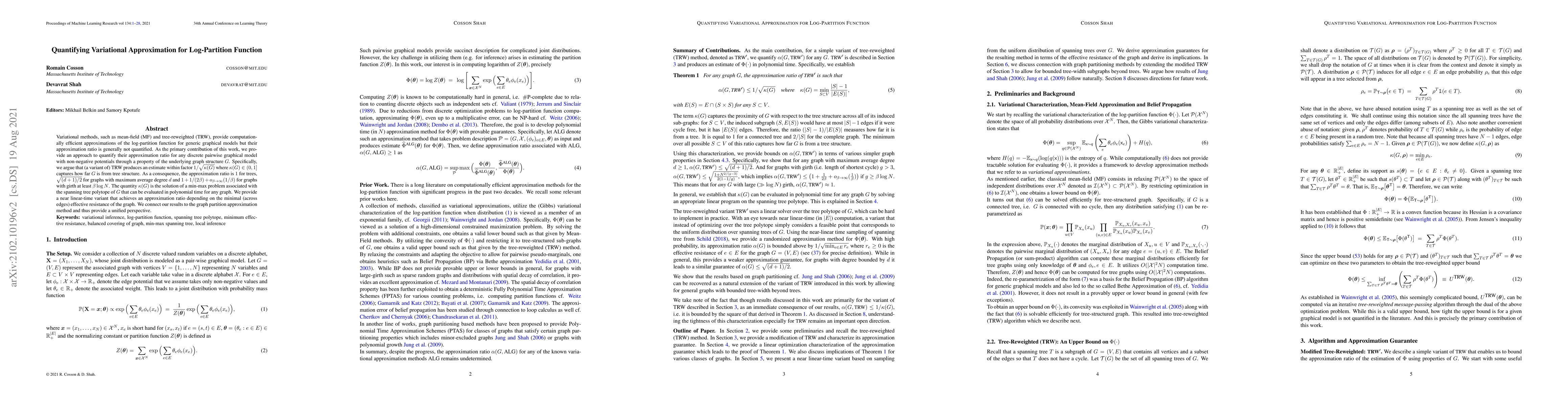 Variational approximation, such as mean-field (MF) and tree-reweighted (TRW), provide a computationally efficient approximation of the log-partition function for a generic graphical model. TRW provably provides an upper bound, but the approximation ratio is generally not quantified. As the primary contribution of this work, we provide an approach to quantify the approximation ratio through the property of the underlying graph structure. Specifically, we argue that (a variant of) TRW produces an estimate that is within factor $\frac{1}{\sqrt{\kappa(G)}}$ of the true log-partition function for any discrete pairwise graphical model over graph $G$, where $\kappa(G) \in (0,1]$ captures how far $G$ is from tree structure with $\kappa(G) = 1$ for trees and $2/N$ for the complete graph over $N$ vertices. As a consequence, the approximation ratio is $1$ for trees, $\sqrt{(d+1)/2}$ for any graph with maximum average degree $d$, and $\stackrel{\beta\to\infty}{\approx} 1+1/(2\beta)$ for graphs with girth (shortest cycle) at least $\beta \log N$. In general, $\kappa(G)$ is the solution of a max-min problem associated with $G$ that can be evaluated in polynomial time for any graph. Using samples from the uniform distribution over the spanning trees of G, we provide a near linear-time variant that achieves an approximation ratio equal to the inverse of square-root of minimal (across edges) effective resistance of the graph. We connect our results to the graph partition-based approximation method and thus provide a unified perspective. Keywords: variational inference, log-partition function, spanning tree polytope, minimum effective resistance, min-max spanning tree, local inference