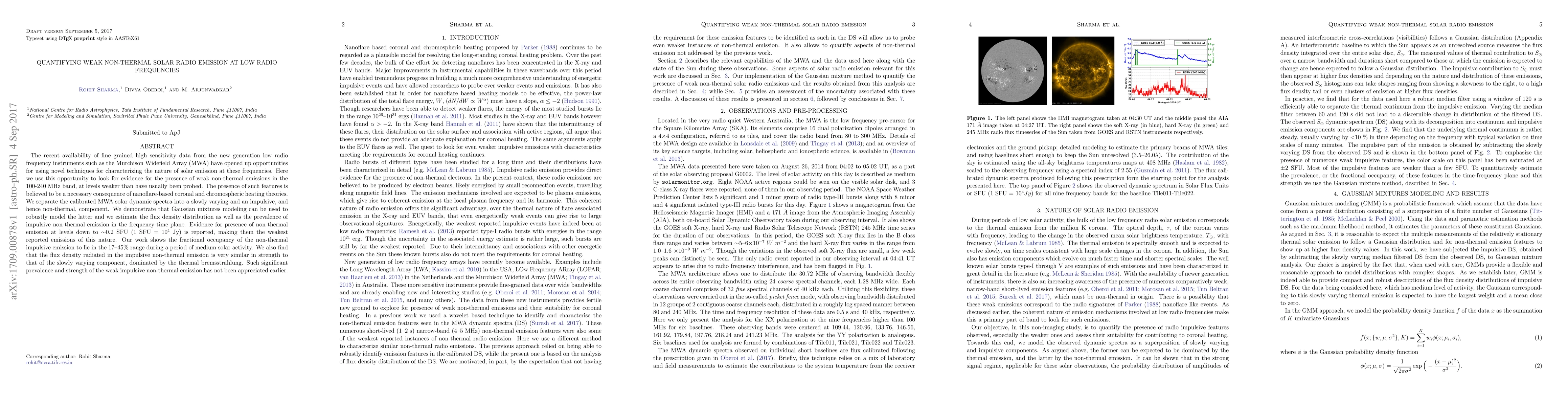 The recent availability of fine grained high sensitivity data from the new generation low radio frequency instruments such as the Murchison Widefield Array (MWA) have opened up opportunities for using novel techniques for characterizing the nature of solar emission at these frequencies. Here we use this opportunity to look for evidence for the presence of weak non-thermal emissions in the 100-240 MHz band, at levels weaker than have usually been probed. The presence of such features is believed to be a necessary consequence of nanoflare-based coronal and chromospheric heating theories. We separate the calibrated MWA solar dynamic spectra into a slowly varying and an impulsive, and hence non-thermal, component. We demonstrate that Gaussian mixtures modeling can be used to robustly model the latter and we estimate the flux density distribution as well as the prevalence of impulsive non-thermal emission in the frequency-time plane. Evidence for presence of non-thermal emission at levels down to $\sim$0.2 SFU (1 SFU = 10$^4$ Jy) is reported, making them the weakest reported emissions of this nature. Our work shows the fractional occupancy of the non-thermal impulsive emission to lie in the 17--45\% range during a period of medium solar activity. We also find that the flux density radiated in the impulsive non-thermal emission is very similar in strength to that of the slowly varying component, dominated by the thermal bremsstrahlung. Such significant prevalence and strength of the weak impulsive non-thermal emission has not been appreciated earlier.