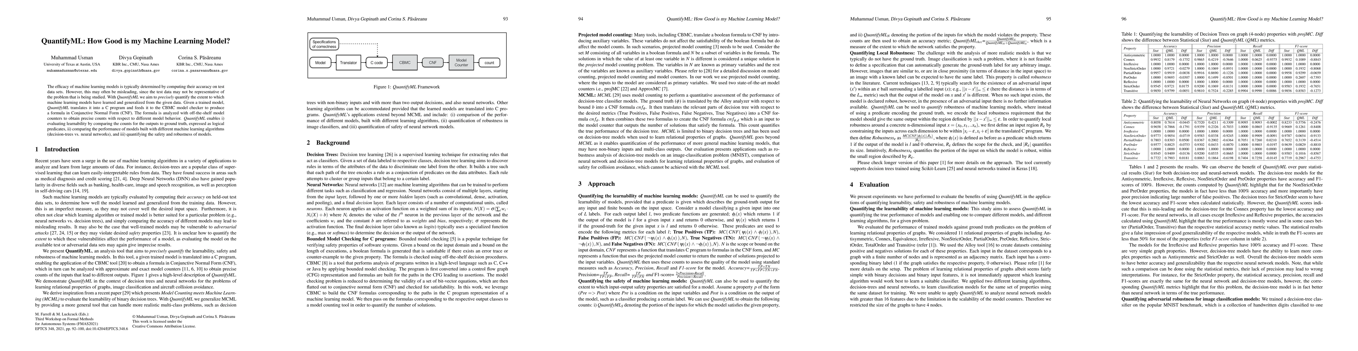 This paper introduces QuantifyML, a tool that analyzes machine learning models to quantify their learnability, safety, and robustness, providing precise counts of model behavior.